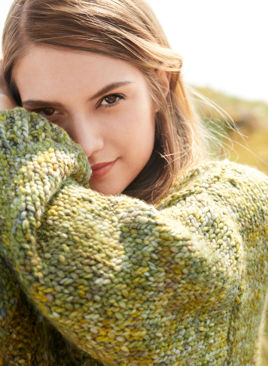 700 (750) g of Lana Grossa Lala Berlin Chunky (80% pure wool, 15% silk, 5% polyamide; 50 m/50 g) in Light-/Dark Olive/Yellow-Green/Natural/Dark Grey (col 104). Size 10 mm needles; size 10 mm circular needles, 60 and 120 cm long