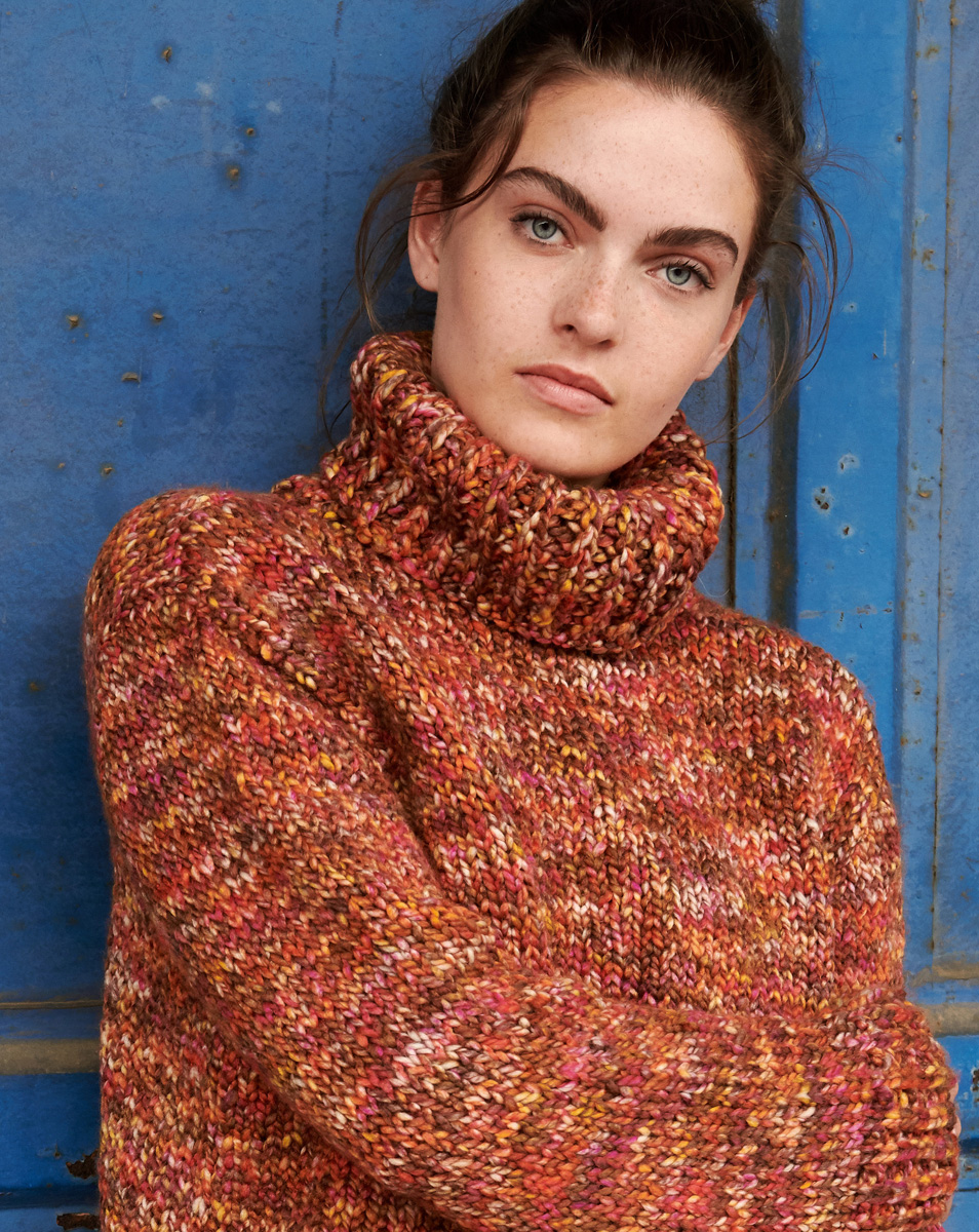 700 (750) g of Lana Grossa Lala Berlin Chunky (80% pure wool, 15% silk, 5% polyamide; 50 m/50 g) in Orange/ Yellow/Cyclamen/Rosewood (col 103). Size 8 mm needles; size 8 mm circular needle, 50 cm long