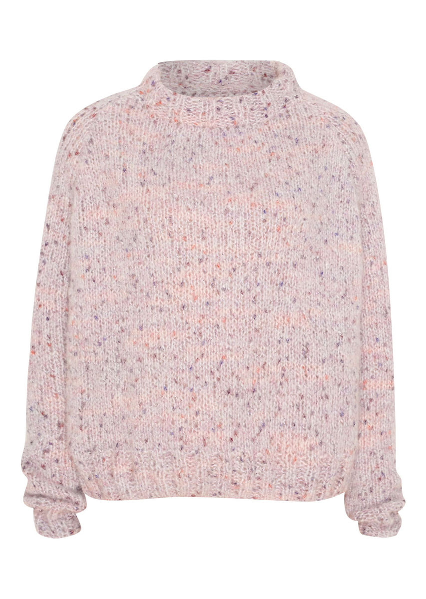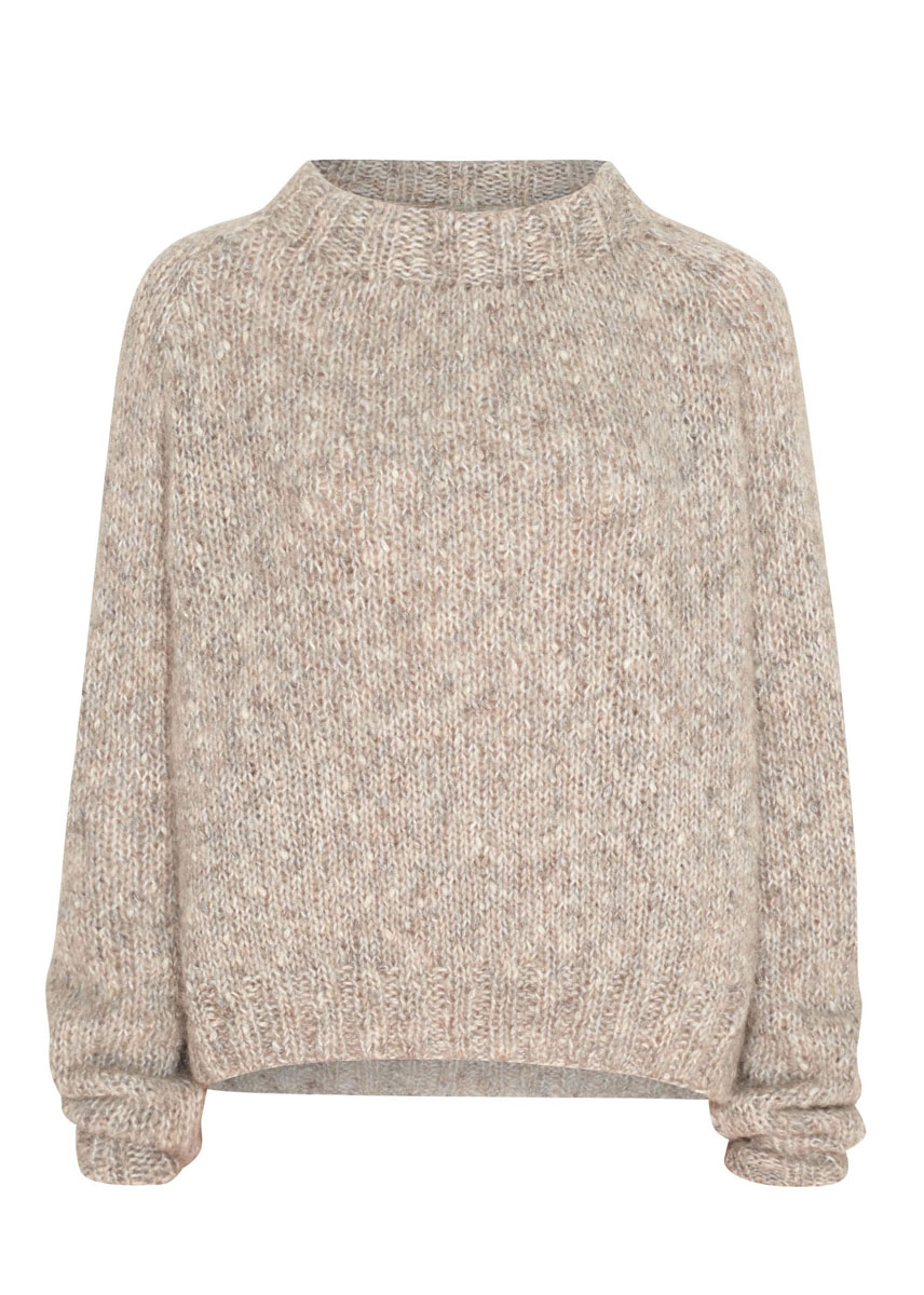 Lana Grossa Lala Berlin Fluffy (42% pure wool, 21% polyamide, 19% alpaca, 18% mohair; 130 m/50 g). Size 5, 6 and 6.5 mm needles; size 6 mm circular needle, 40 cm long. For version A: 300 (350, 400) g in Greige Melange (col 103). For version B: 300 (350, 400) g in Pink Melange (col 114)