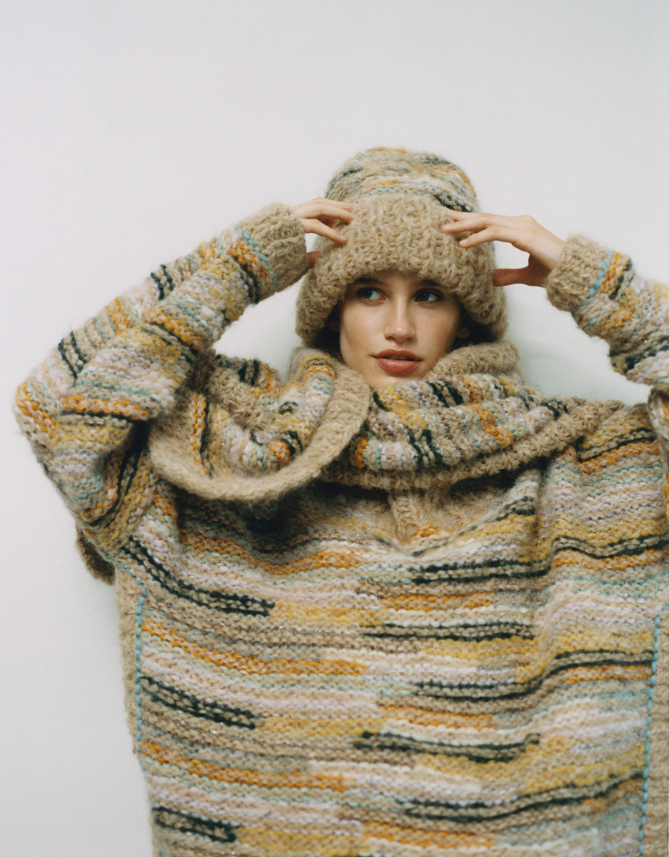 300 g of Lana Grossa Lala Berlin Furry (90% baby alpaca, 10% polyamide; 75 m/50 g) in Beige (col 2) and 50 g each in Charcoal (col 10), Grey (col 11), Pastel Pink (col 12), Yellow (col 3) and Natural (col 1); 50 g each of Lana Grossa Lala Berlin Fluffy (42% superfine Merino wool, 21% polyamide, 19% baby alpaca, 18% superkid mohair; 130 m/50 g) in Turquoise Mélange (col 118), Lilac Mélange (col 121) and Saffron Mélange (col 124); 50 g each of Lana Grossa Lala Berlin Shiny (46% baby alpaca, 30% cotton, 8% Merino wool, 8% polyester, 8% polyamide; 150 m/50 g) in Greige (col 14) and Camel/Beige (col 18); 50 g of Lana Grossa Lala Berlin Lovely Cotton (75% superfine Merino wool; 25% cotton; 75 m/50 g) in Bleu (col 1). Size 8 and 9 mm circular needles, each 60 cm long; size 8 mm circular needle, 50 cm long; tapestry needle