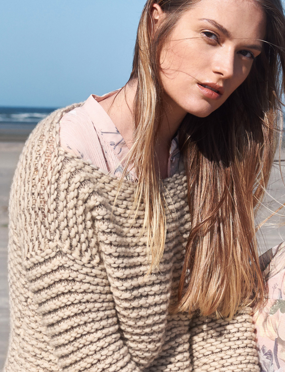 225 (250, 275) g of Lana Grossa Lala Berlin Lovely Cashmere (60% cashmere, 25% polyamide, 15% pure wool; 60 m/25 g) in Beige (col 8) and 100 g of Lana Grossa Cashmere 16 Fine (80% pure wool, 10% cashmere, 10% polyamide; 320 m/50 g) in Taupe (col 7). Size 6 and 7.5 mm needles
