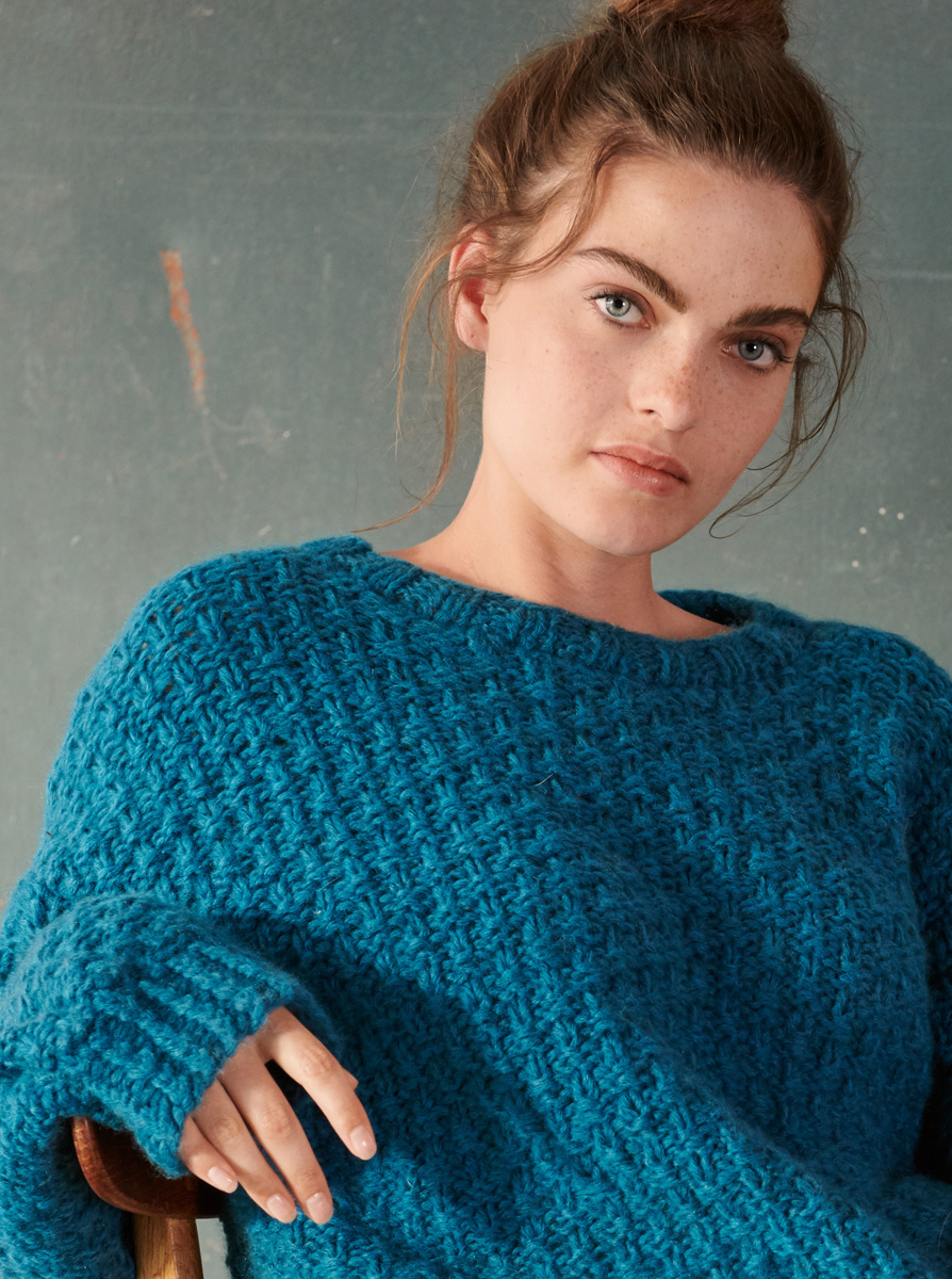 375 (400) g of Lana Grossa Lala Berlin Lovely Cashmere (60% cashmere, 25% polyamide, 15% pure wool; 60 m/25 g) in Jeans (col 4). Size 9 and 10 mm needles; size 9 mm circular needle, 60 cm long; size 6 mm crochet hook