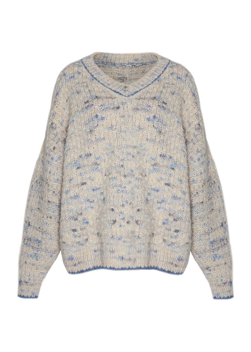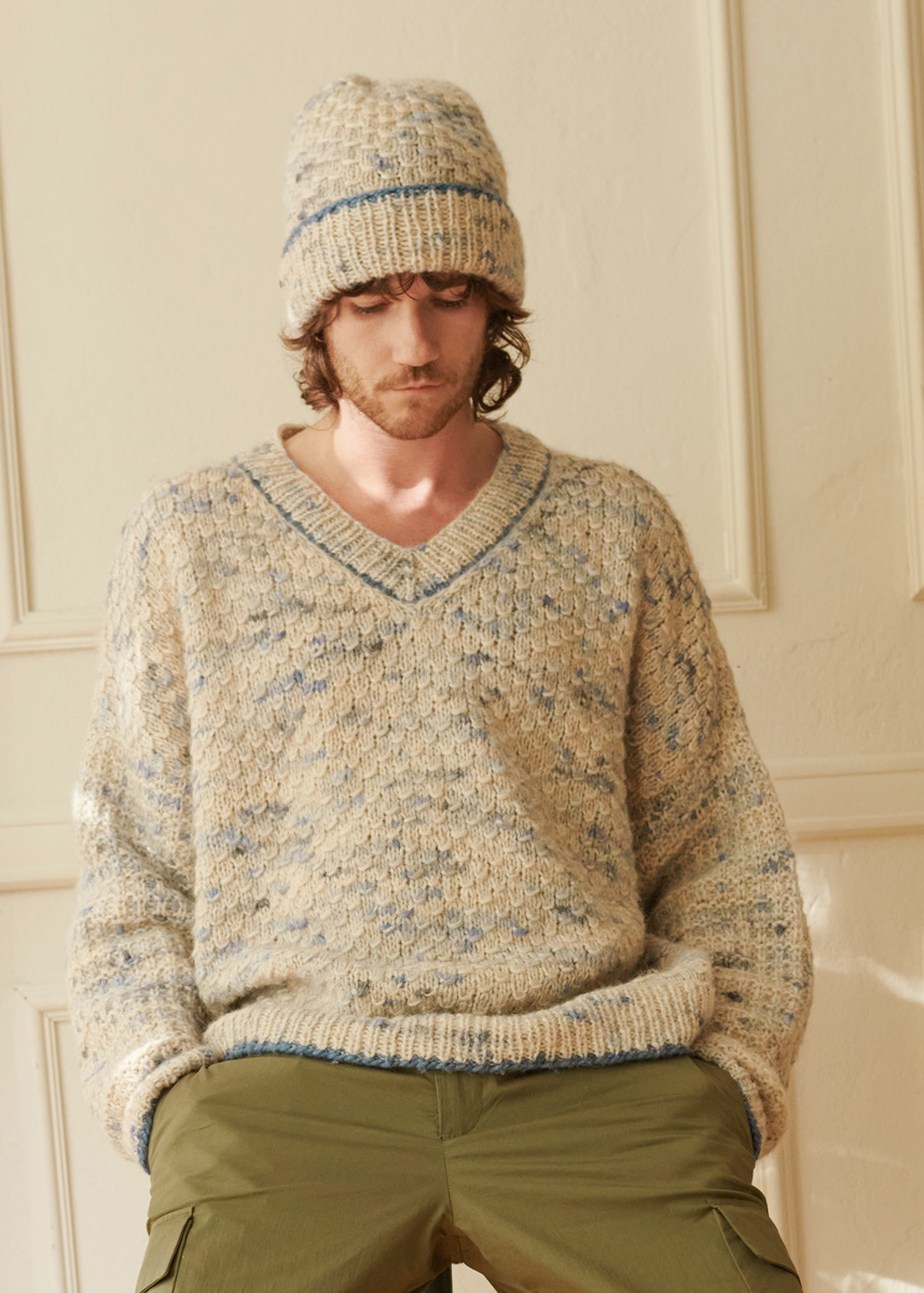 550 (600) g of Lana Grossa Lala Berlin Lovely Cotton Inserto (50% baby alpaca, 35% cotton, 15% pure wool; 110 m/50 g) in Natural/Dove Blue/Light Blue/Grey (col 109); 50 g of Lana Grossa Lala Berlin Lovely Cotton (75% extrafine Merino wool; 25% cotton; 90 m/50 g) in Jeans (col 14). Size 5 and 6 mm needles; size 5 mm circular needle, 60 cm long; size 5 mm crochet hook