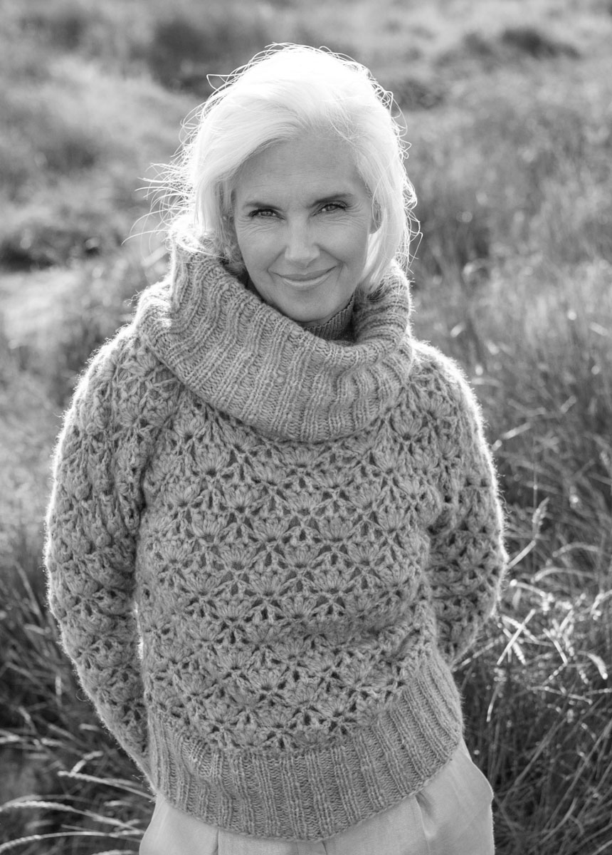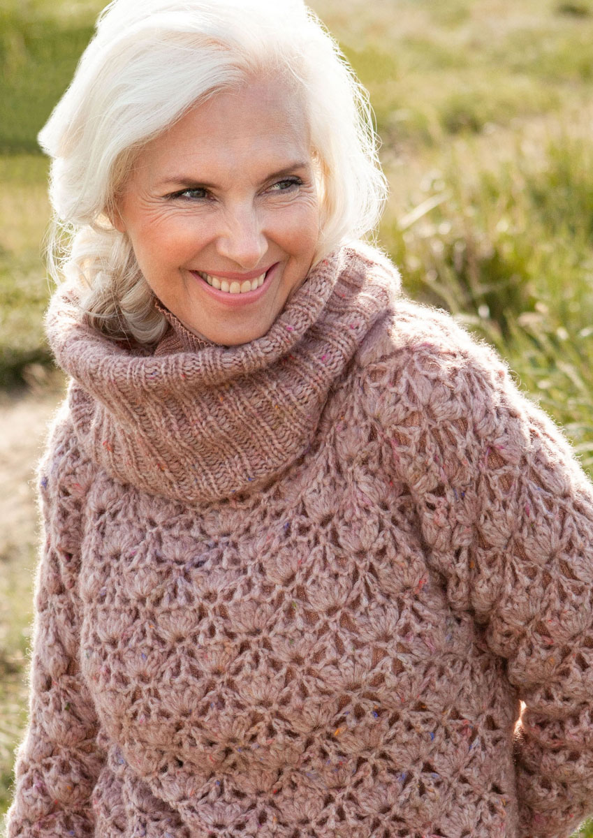 350 (400, 450) g of Lana Grossa Lala Berlin Lovely Fine Tweed (37% baby alpaca, 35% polyamide; 26% extrafi ne Merino wool, 2% viscose; 175 m/50 g) in Rose Quartz (col 103). Size 4.5 mm needles; size 4.5 mm circular needle, 40 cm long; size 5 mm crochet hook