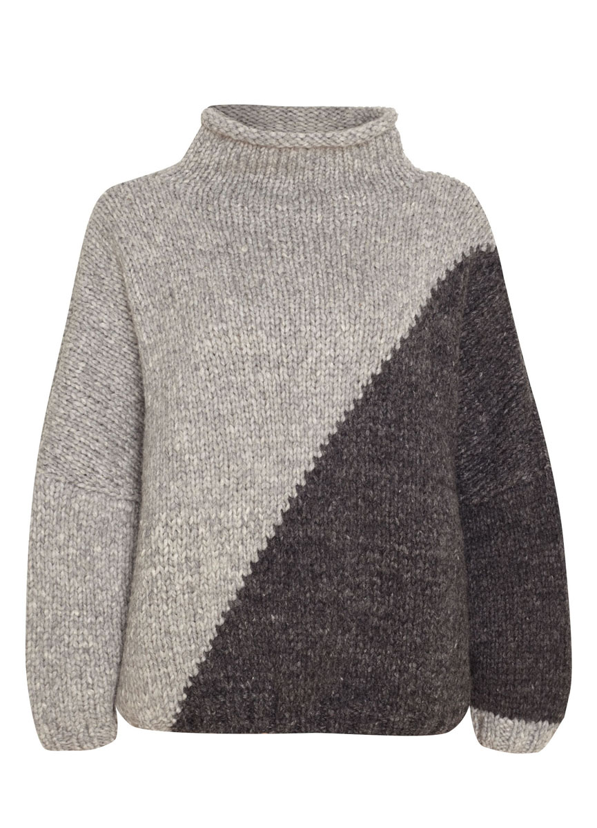 Lana Grossa Lala Berlin Lovely (52% alpaca, 18% cashmere, 18% pure wool, 12% polyamide; 90 m/50 g). Size 5 and 7 mm needles; size 7 mm circular needle, 40 cm long. For version A: 250 (300, 350) g each in Beige (col 2) and Camel Melange (col 14). For version B: 250 (300, 350) g each in Light Grey Melange (col 6) and Charcoal (col 7).
