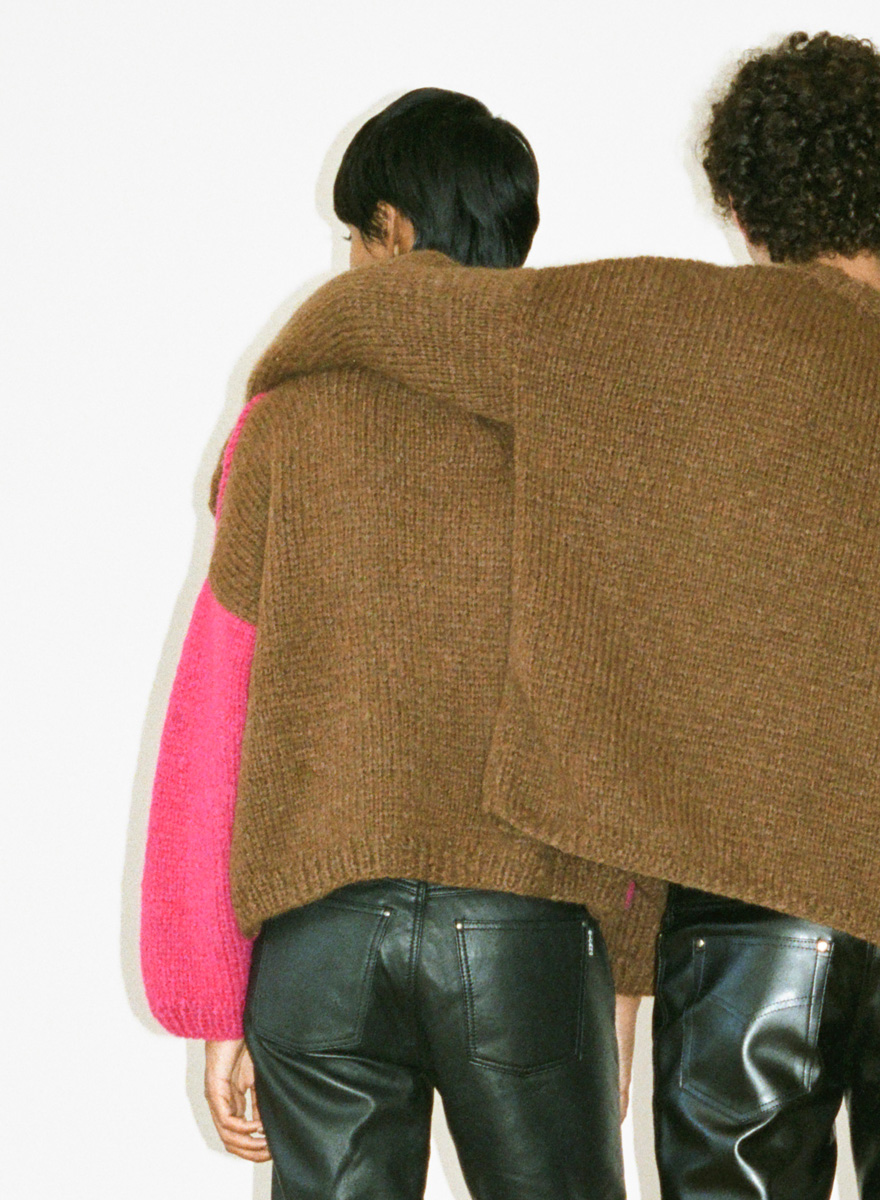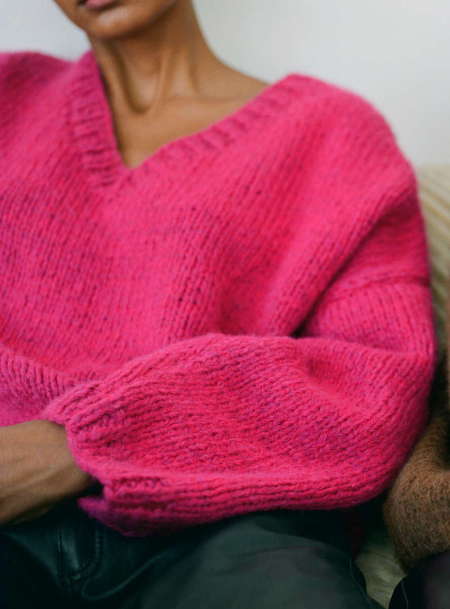 250 (300, 350) g each of Lana Grossa Lala Berlin Lovely (52 % alpaca, 18 % cashmere, 18 % pure wool, 12 % polyamide; 90 m / 50 g) in Neon Cyclamen (col 17) and Brown Mélange (col 21). Size 5 and 6 mm needles; size 5 mm circular needle, 40 cm long