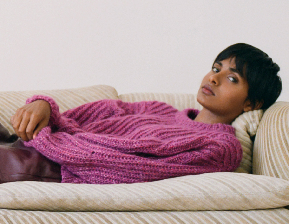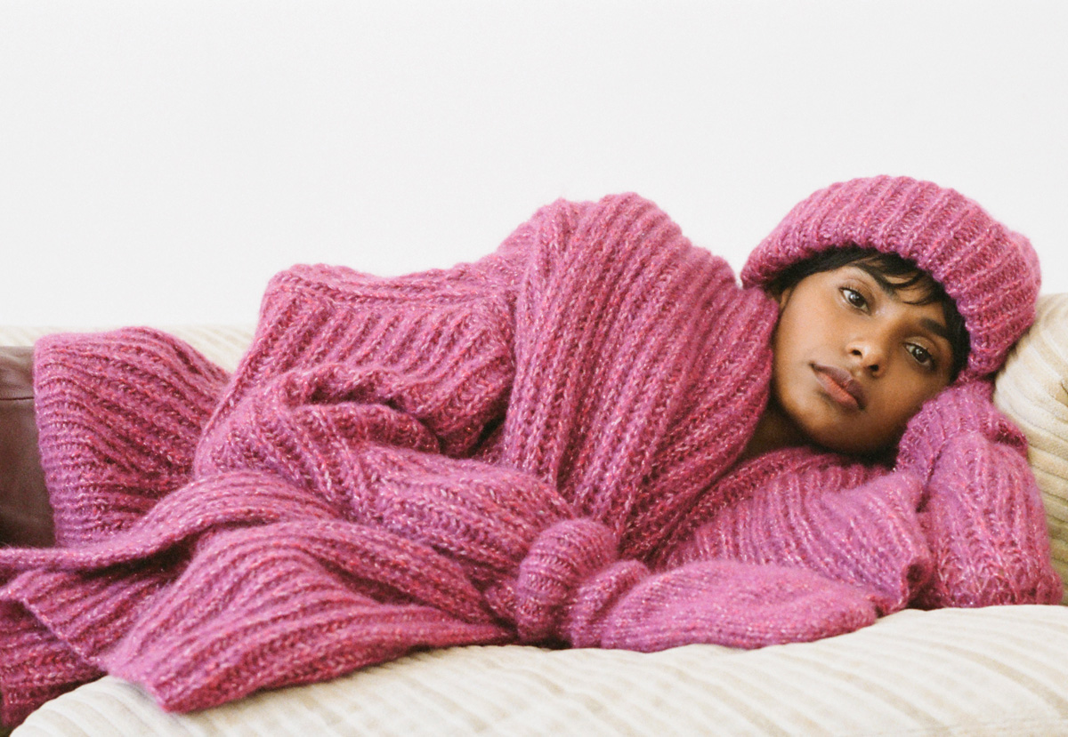 350 (400, 450) g of Lana Grossa Lala Berlin Shiny (46 % alpaca, 30 % cotton, 8 % pure wool, 8 % polyamide, 8 % polyester; 150 m / 50 g) in Cyclamen (col 1). Size 4.5 mm needles; size 4.5 mm circular needle, 40 cm long