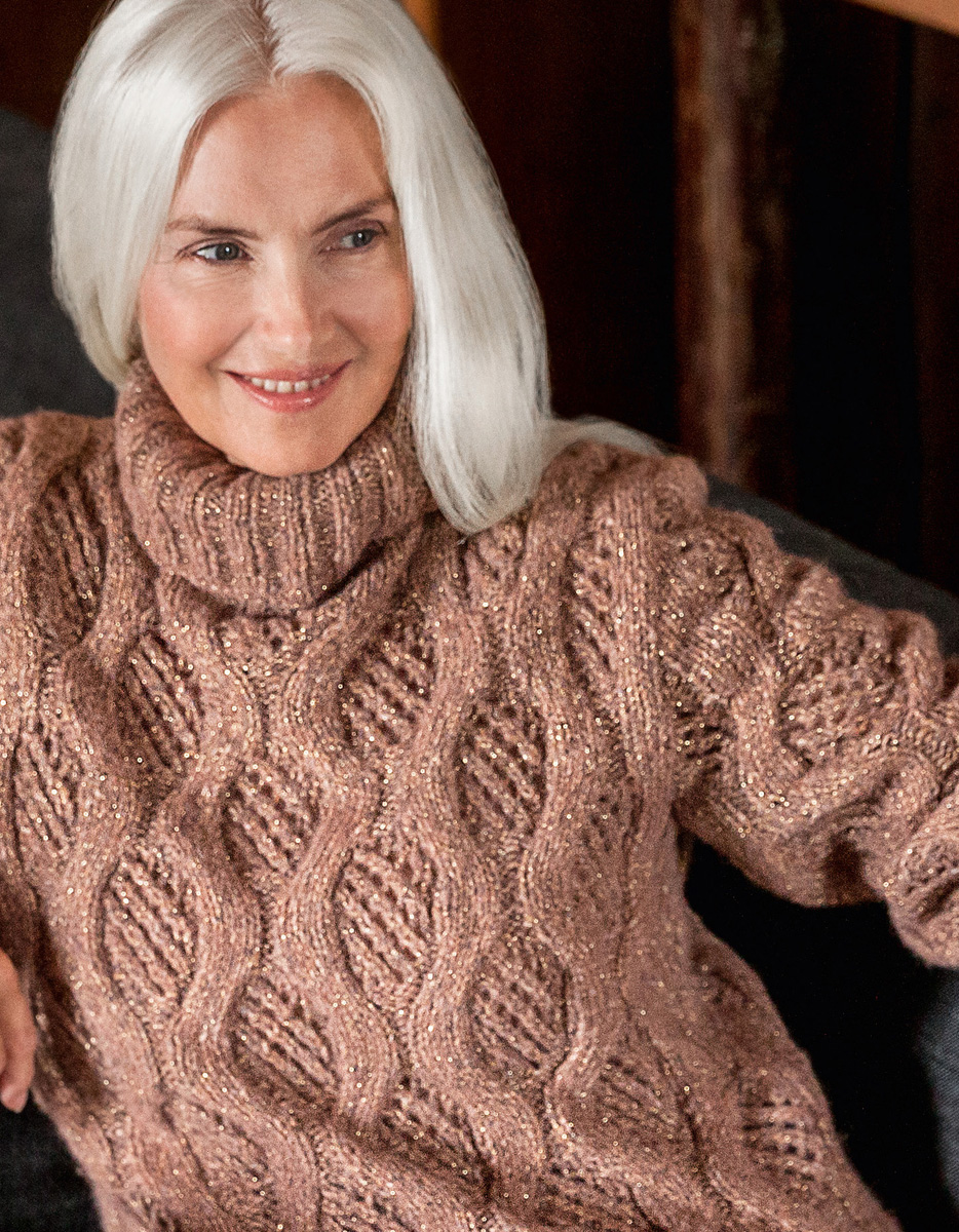 450 g of Lana Grossa Lala Berlin Shiny (46% baby alpaca, 30% cotton, 8% Merino wool, 8% polyester, 8% polyamide; 150 m/50 g) in Camel/Grey (col 16). Size 4.5 and 5.5 mm needles; size 4.5 mm circular needle, 40 cm long; cable needle [cn]