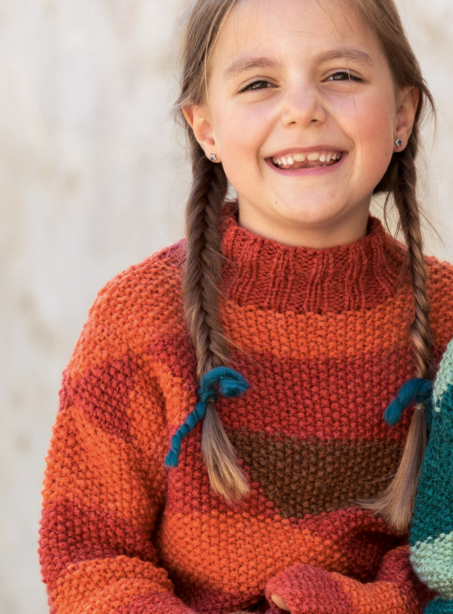 200 (250) g of Lana Grossa Landlust Merino 120 (100% superwash Merino wool; 120 m/50 g) in Salmon (col 131), 150 g in Coral (col 130) and 50 g in Doe Brown (col 127). Size 5.5 mm needles; size 5.5 mm circular needle, 40 cm long