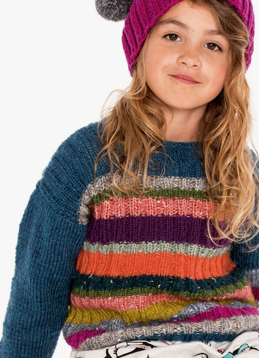 Red Violet (col 222) and 50 g each of Lana Grossa Cometa (34% baby alpaca, 6% Merino wool, 22% viscose, 33% polyamide, 5% polyester; 130 m/50 g) in Light Grey/Gold/Silver (col 9), Light Red/Gold/Silver (col 17), Grey-Blue/Silver (col 10), Pale Green/Silver (col 20) and Dark Petrol/Gold/Silver (col 21). Size 5 mm needles; size 4.5 mm circular needle, 40 cm long