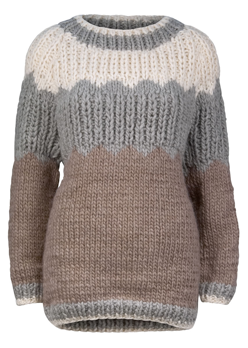 Version B: 400 (450, 500) g in Taupe (col 13), 350 (400, 450) g in Heathered Light Grey (col 31) and 150 (150, 200) g in Natural (col 14).