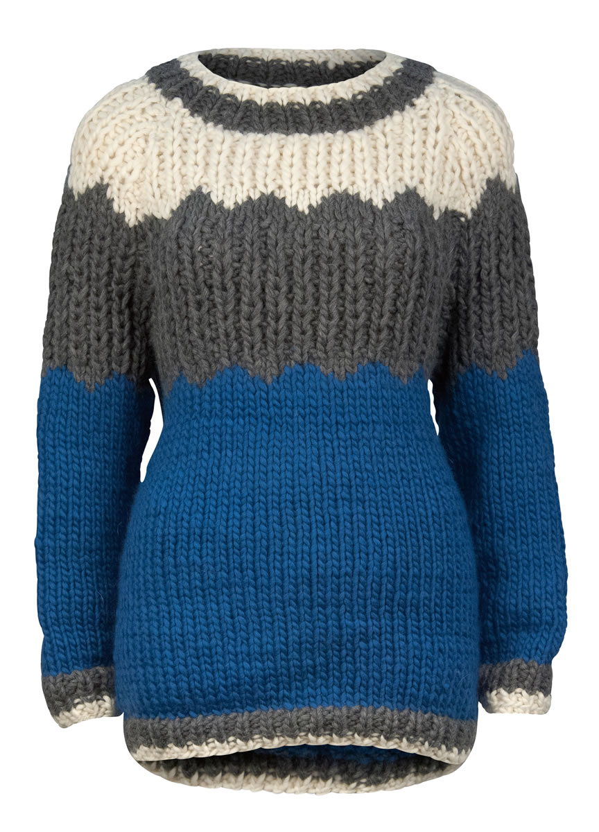 Version C: 400 (450, 500) g in Jeans (col 75), 350 (400, 450) g in Heathered Dark Grey (col 12) and 150 (150, 200) g in Natural (col 14).
