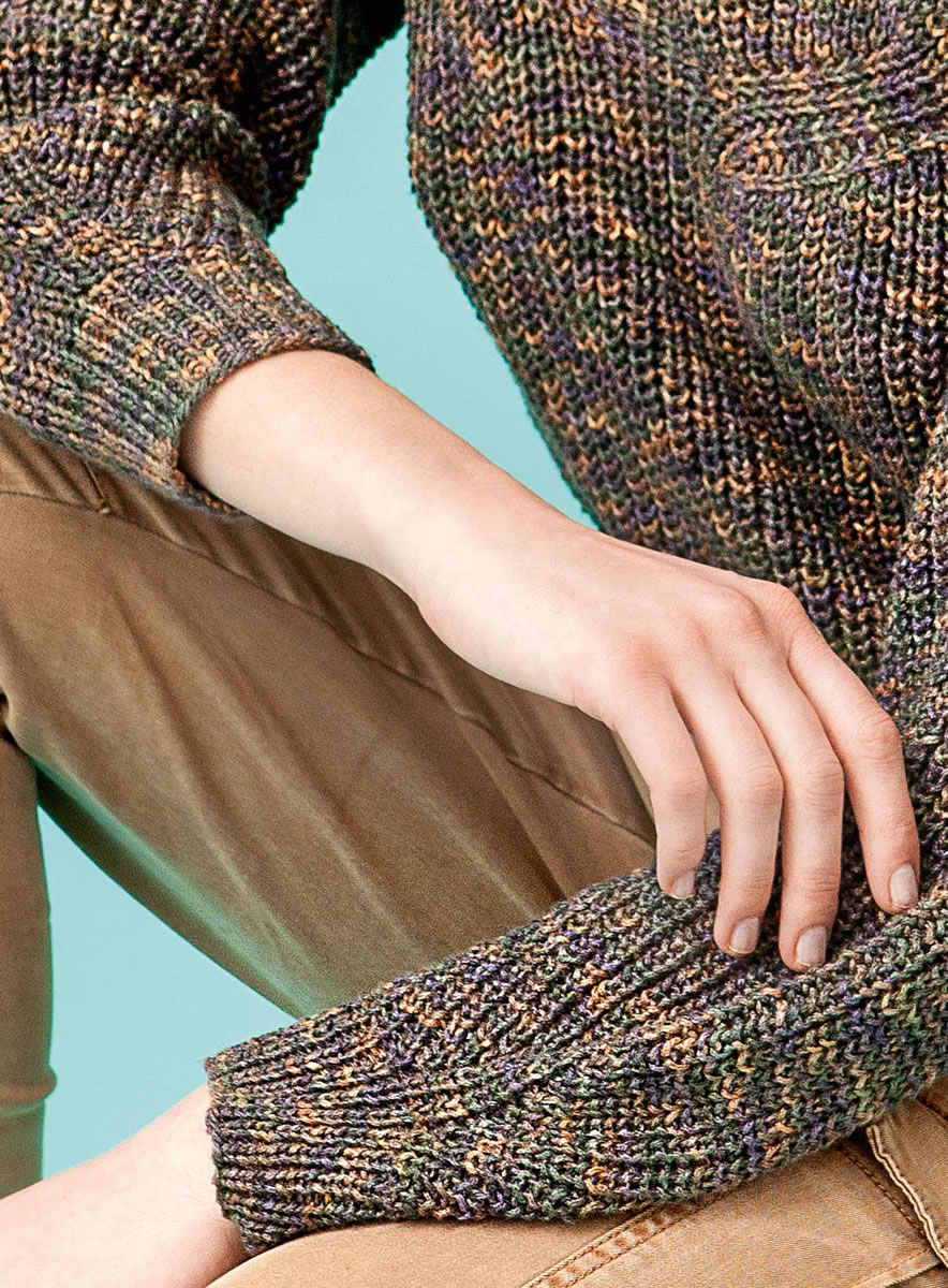 750 (800, 860) g of Lana Grossa Linarte Color (40% viscose, 30% cotton, 20% linen; 10% polyamide; 125 m/50 g) in Black-Green/Brown/Slate (col 104). Size 4 mm needles; short size 4 mm circular needle.