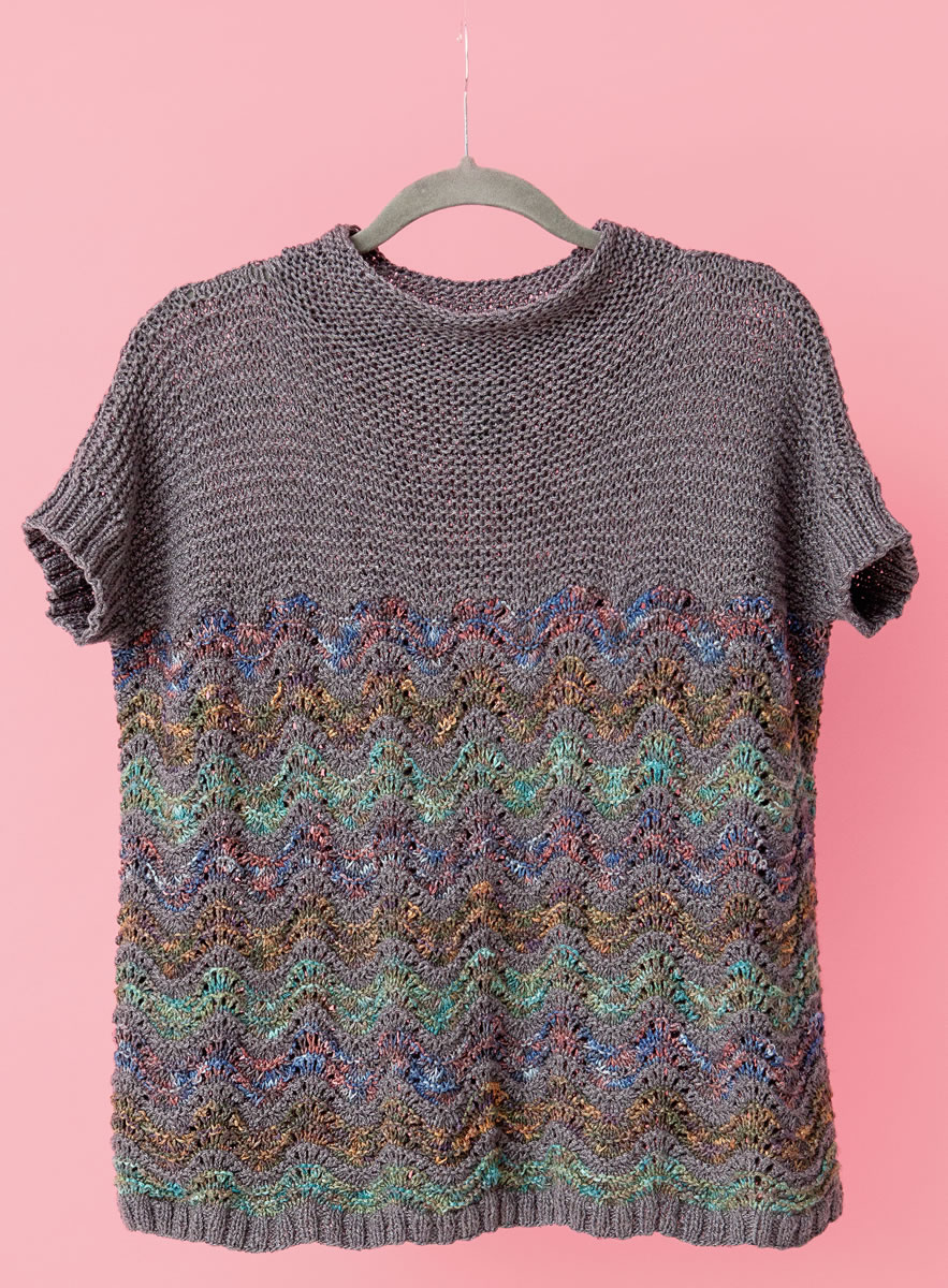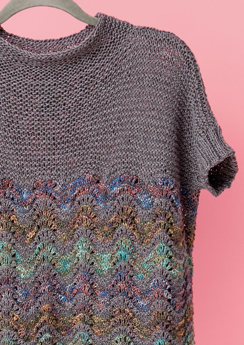100 g of Lana Grossa Linarte Color (40% viscose, 30% cotton, 20% linen; 10% polyamide; 125 m/50 g) in Turquoise/Olive/Petrol/Khaki (col 107), 100 g in Black-Green/Brown/Slate (col 104) and 100 g in Blue-Grey/Chestnut/Dark Grey (col 106) and 200 g of Lana Grossa Linarte (40% viscose, 30% cotton, 20% linen, 10% polyamide; 125 m/50 g) in Dark Grey (col 46). Size 4.5 and 7 mm needles; size 4.5 and 7 mm short circular needles
