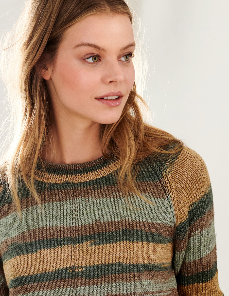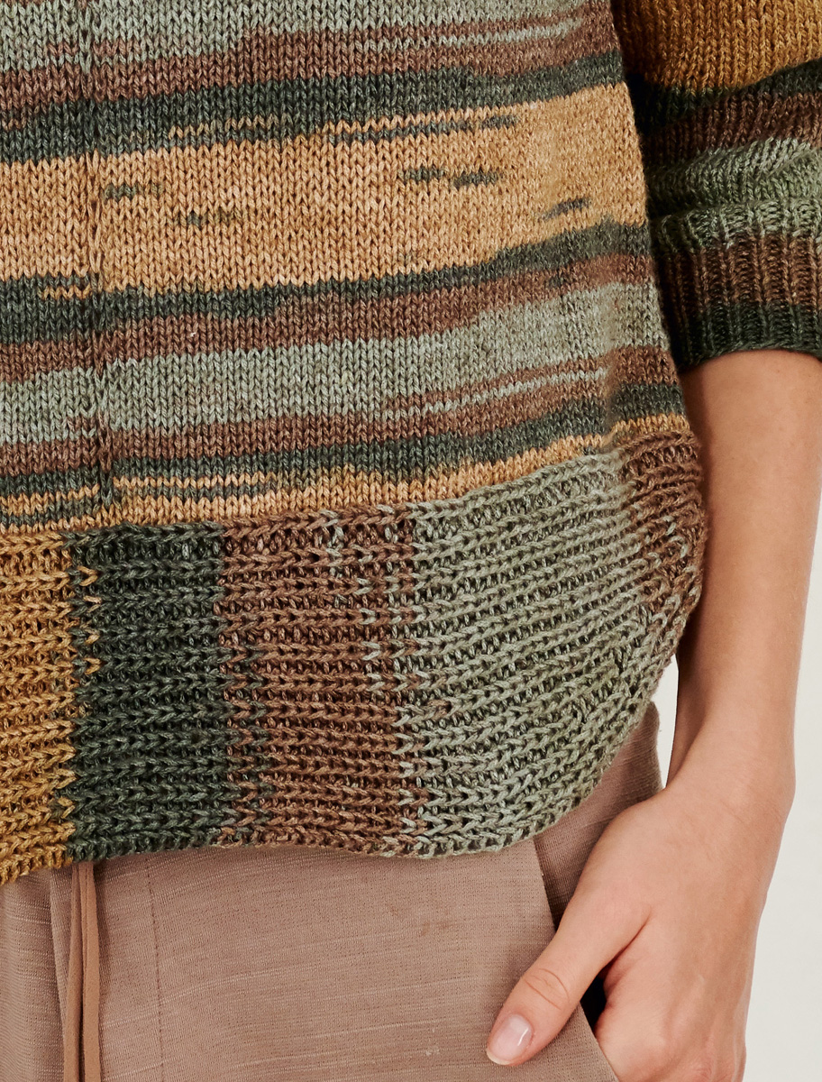 450 (500, 550) g of Lana Grossa Linarte Dégradé (40% viscose, 30% cotton, 20% linen, 10% polyamide; 125 m/50 g) in Beige/Grey-Brown/Grey-Green/Graphite (col 202). Size 3 and 4 mm needles; size 3 mm circular needle, 40 cm long