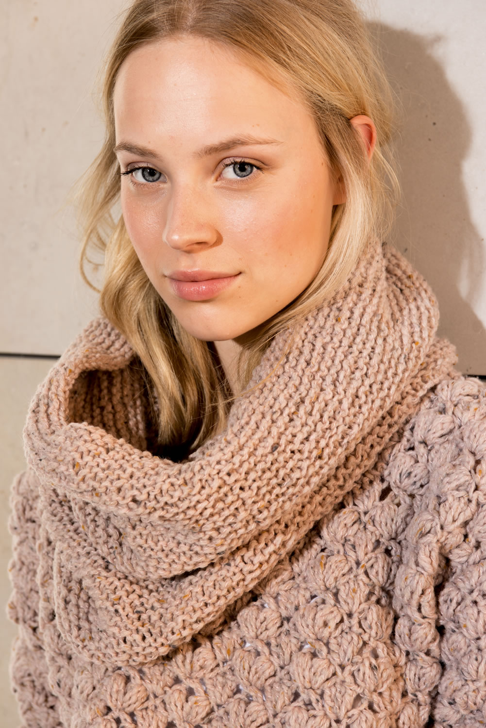 650 (700, 750) g of Lana Grossa Royal Tweed (100% pure wool; 50 g = 100 m) in Heathered Pink (col 81). Size 5.5 mm crochet hook; size 6 mm circular needle, 40 cm long.