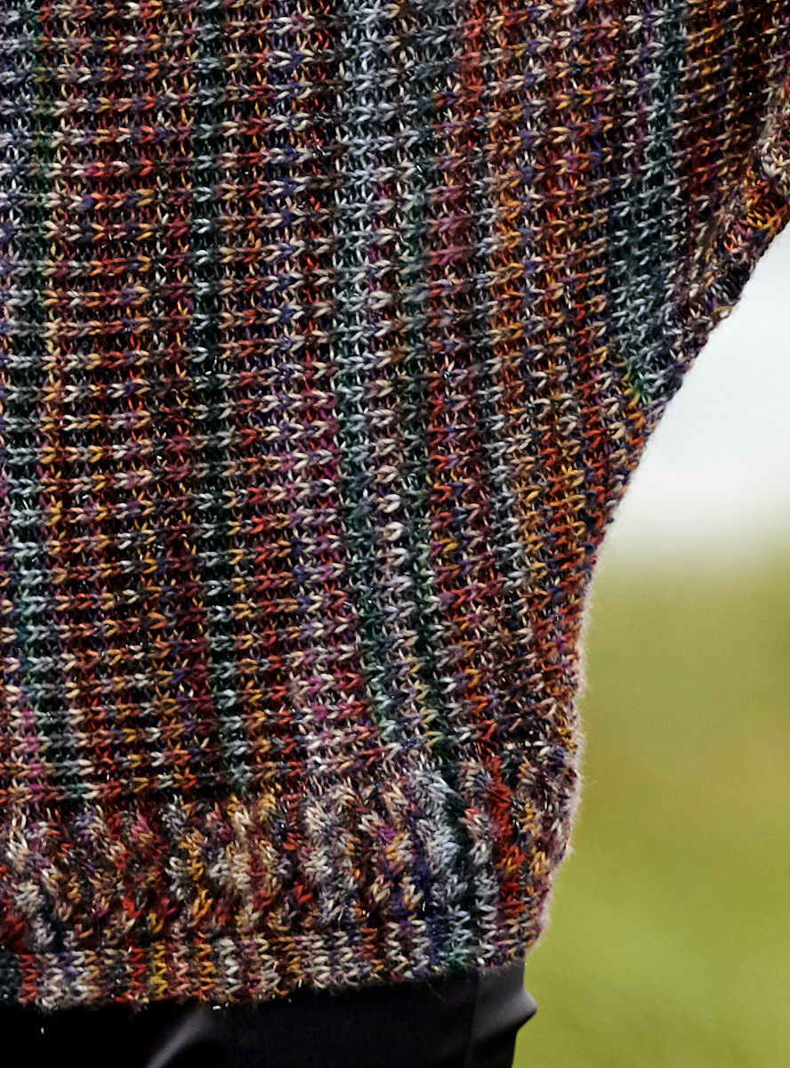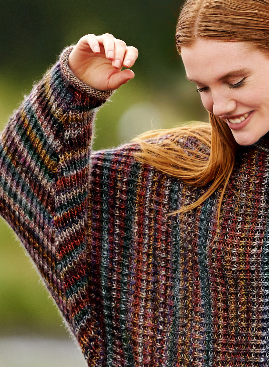 500 (600) g of Lana Grossa Lucia (50% acrylic, 40% Merino wool, 9% polyamide, 1% polyester; 280 m/100 g) in Gold/Brown/Orange/Charcoal/Aubergine (col 204). Size 4.5 mm needles; size 4 mm circular needle, 40 cm long; cable needle [cn]