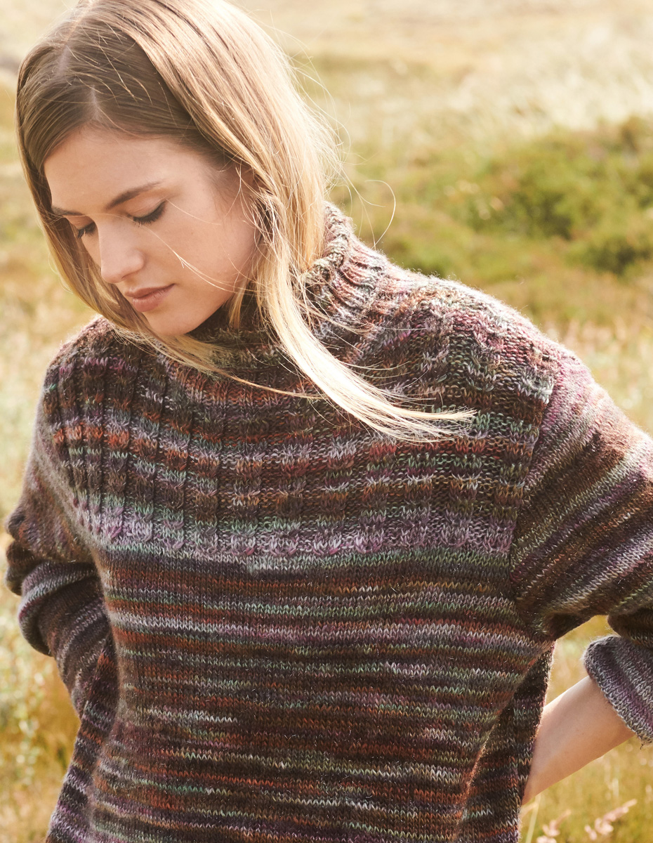 400 (500) g of Lana Grossa Lucia (50% acrylic, 40% Merino wool, 9% polyamide, 1% polyester; 280 m/100 g) in Light-/Grey-Green/Black (col 202). Size 3.5 and 4 mm needles; size 3.5 and 4 mm circular needles, each 60 cm long; size 3.5 mm circular needle, 40 cm long