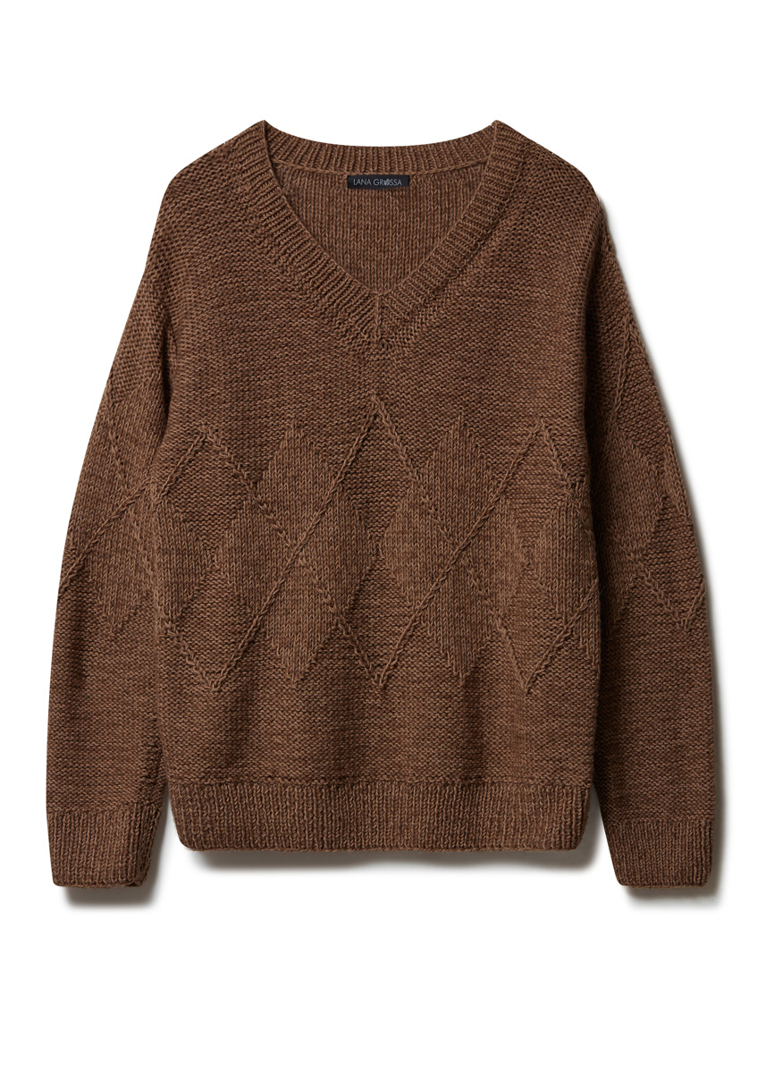 300 (350, 400) g of Lana Grossa Merino Superiore (100% extrafine Merino wool; 180 m/50 g) in Nougat (col 39) and 350 (400, 450) g of Lana Grossa Ecopuno (72% cotton, 17% Merino wool, 11% baby alpaca; 215 m/50 g) in Dark Brown (col 17). Size 5 and 7 mm needles; size 5 mm circular needle, 40 cm long; cable needle [cn].