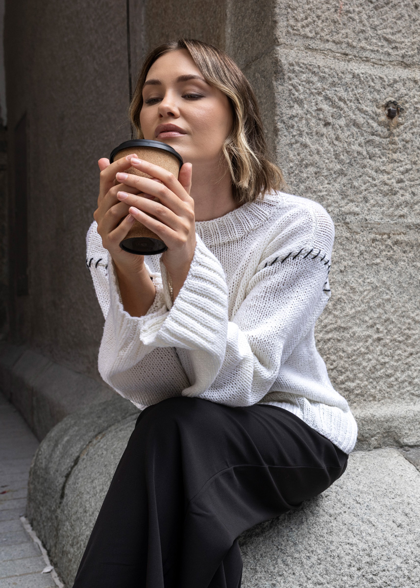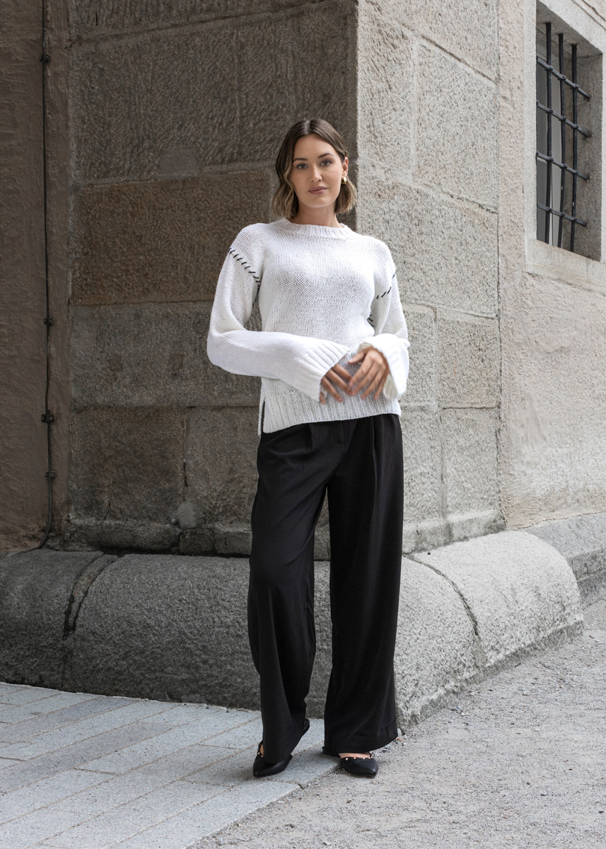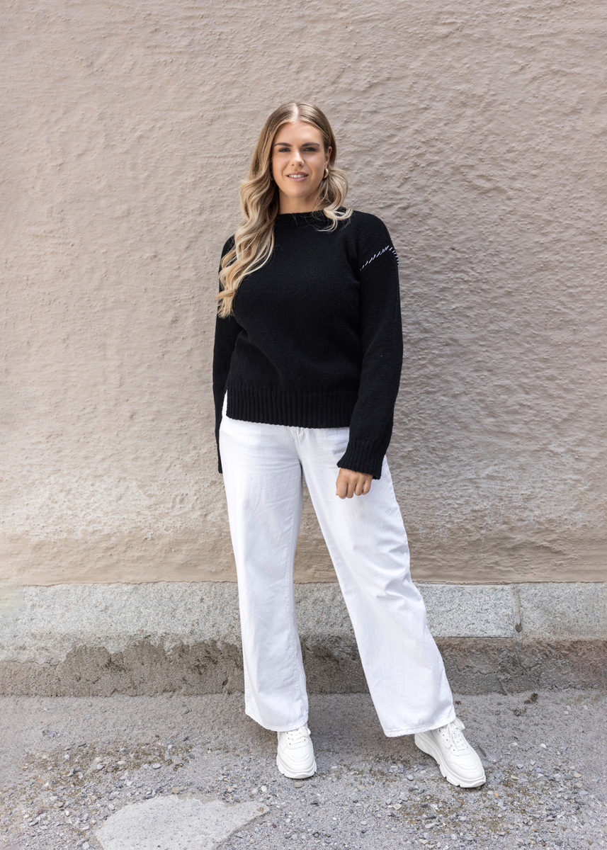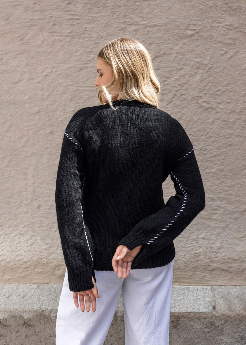The pullover has a total length of 56 (58 - 60 - 62 - 64 - 66) cm and a positive ease of 6 cm at 80 cm bust circumference (6 cm at 88 cm bust circumference - 4 cm at 96 cm bust circumference - 4 cm at 104 cm bust circumference - 4 cm at 116 cm bust circumference - 4 cm at 128 cm bust circumference).