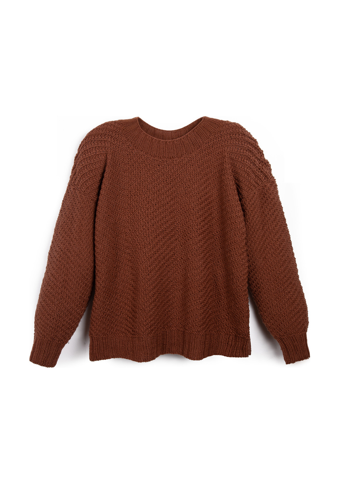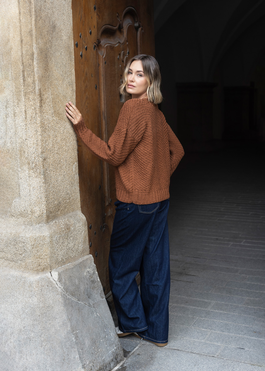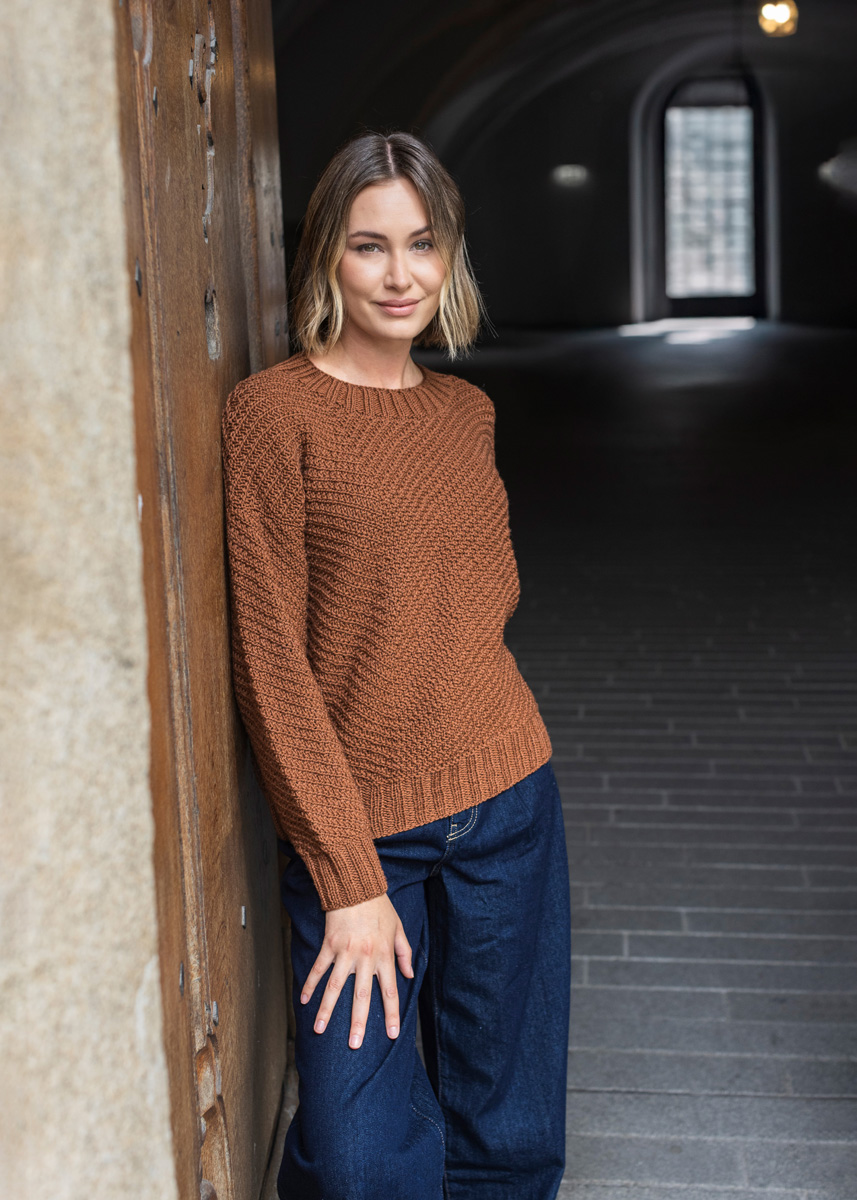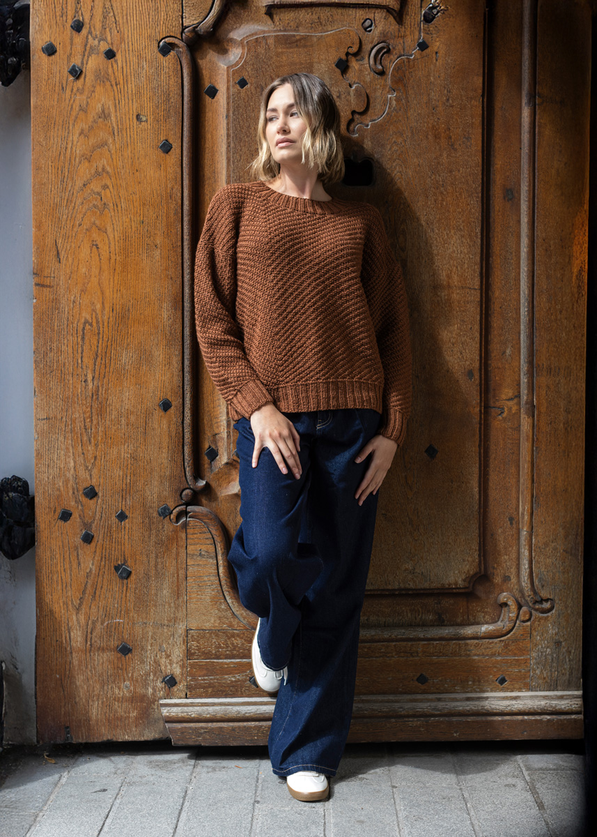 The pullover has a total length of 52 (54 - 56 - 58 - 60 - 62) cm and a positive ease of 20 cm at 80 cm bust circumference (20 cm at 88 cm bust circumference - 18 cm at 96 cm bust circumference - 18 cm at 104 cm bust circumference - 16 cm at 116 cm bust circumference - 14 cm at 128 cm bust circumference).
