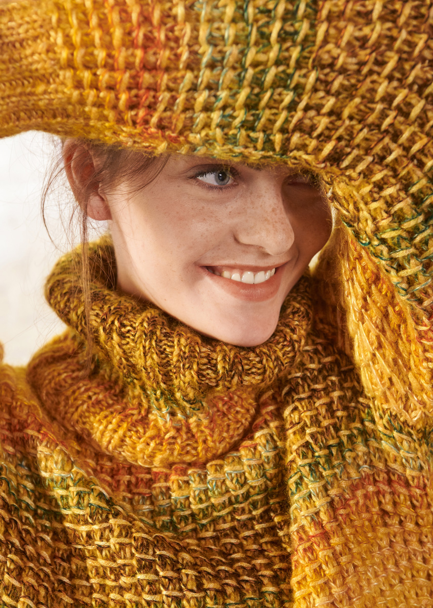 275 (300) g of Lana Grossa Mia (30% mohair, 26% pure wool, 25% silk; 19% polyamide; 105 m/25 g) in Yellow (col 10) and 300 (400) g of Lana Grossa Gioia (50% superwash Merino wool, 50% acrylic; 380 m/100 g) in Yellow/ Orange/Beige/Petrol/Olive/Black/Copper/Grey (col 104). Size 4.5 and 6 mm needles; size 4.5, 6 and 7 mm circular needles, each 50 cm long; size 5 mm crochet hook