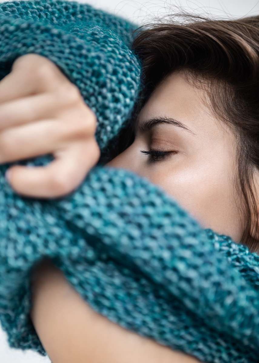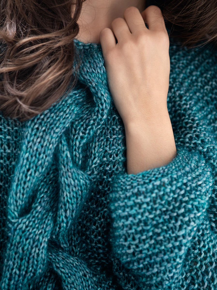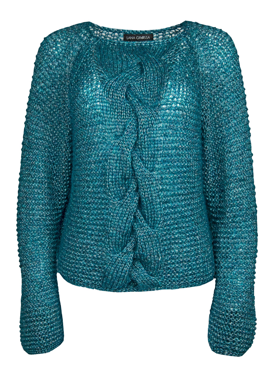 250 (275, 300) g of Lana Grossa Mia (30% mohair, 26% pure wool, 25% silk; 19% polyamide; 105 m/25 g) in Petrol (col 4). Size 5 and 9 mm needles; cable needle [cn]; size 6 mm crochet hook