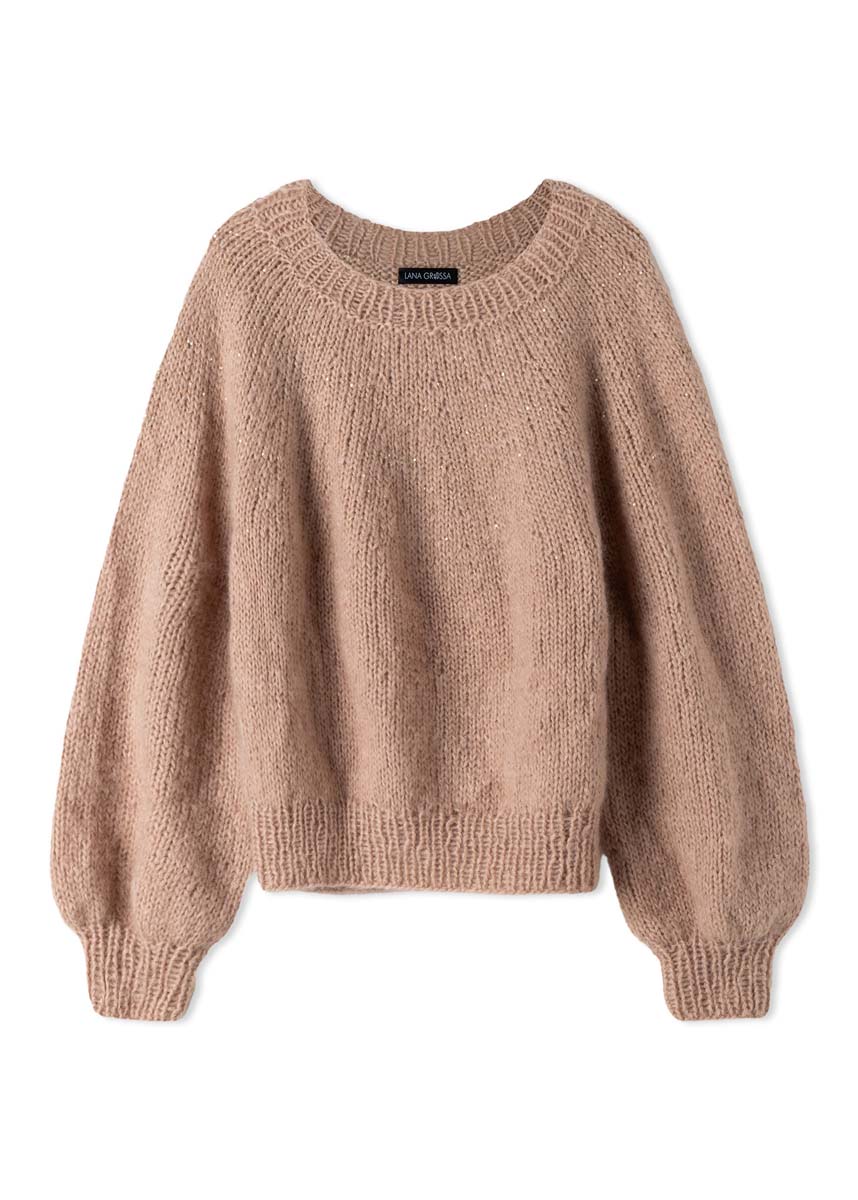 Lana Grossa Mohair di Gio (55% Mohair (Superkid), 45% Schurwolle (Merino superfein), approx. 85 m/50 g), 500 (550 - 600) g beige (col 8) and Lana Grossa Glamour (55% Polyacryl, 45% Polyester, approx. 112 m/50 g), 25 g beige (col 10); 1 circular knitting needle size 7 mm, 60 cm and 100 cm long; 1 circular knitting needle size 8 mm, 50 cm, 80 cm, 100 cm and 120 cm long; double pointed needles size 7 mm; 4 stitch marker; 2 double pointed needles (to put sts on hold)