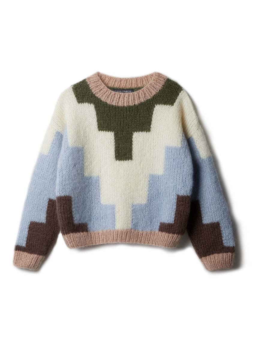 Lana Grossa Mohair di Gio (55 % Mohair, 45 % Virgin wool Merino); 85 m/50 g), 200 (250 - 250) g pastel blue (Fb 10), 100 (150 - 150) g gray brown (Fb 7), 100 (150 - 150) g raw white (Fb 9), 50 (50 - 100) g fern green (Fb 14) and 50 g beige (Fb 8).