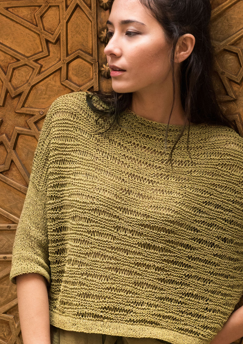 400 (450) g of Lana Grossa Nizza (74% cotton, 25% polyester, 1% polyester (metallized); 115 m 50 g) in Camel/Yellow-Green/Gold (col 14). Size 3.5 and 4.5 mm needles; size 4.5 mm circular needle, 60 cm long