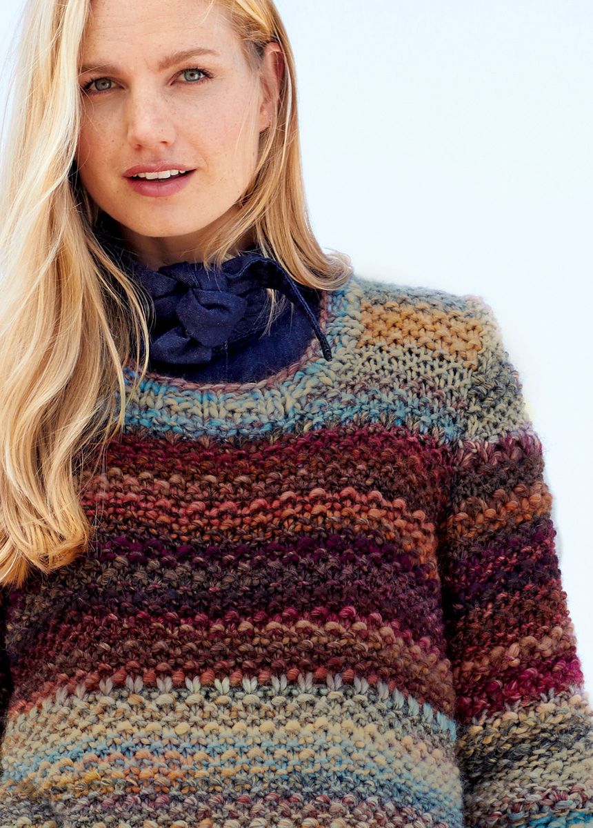 300 (400, 500) g each of Lana Grossa Olympia Classic (53% pure wool, 47% acrylic; 100 m/100 g) in Sand/Mocha/Burgundy/Terracotta (col 71) and Light Grey/Light Blue/Sand/Camel/Dark Brown/Dark Grey (col 73). Size 7.5 and 8 mm needles; size 7.5 mm circular needle, 60 cm long