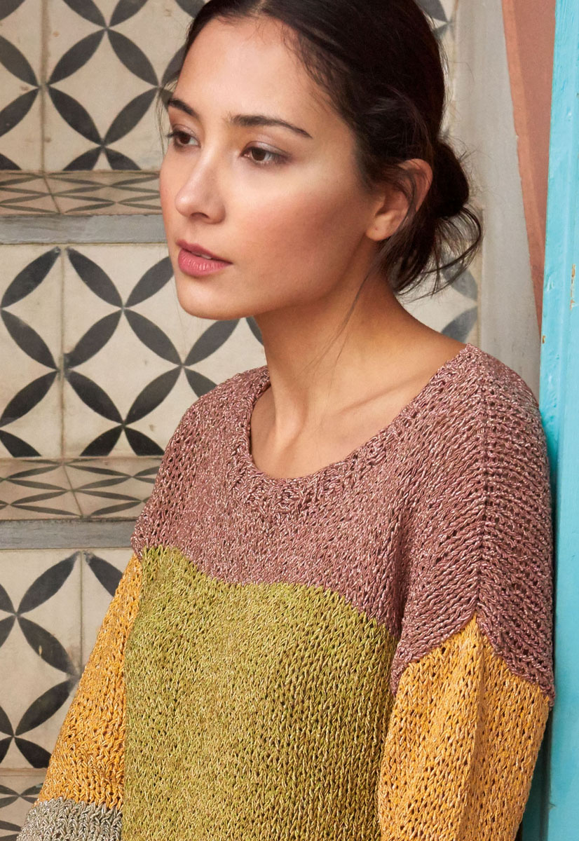 250 (300, 350) g of Lana Grossa Ombra (75% cotton, 25% polyester; 120 m 50 g) in Beige/Pistachio (col 7), 200 (200, 250) g in Greige/Beige (col 6), 150 (150, 200) g in Beige/Yellow (col 8) and 100 (150, 200) g in Pink/Beige (col 4). Size 7.5 and 8 mm needles; size 7 and 8 mm circular needles, each 60 cm long.