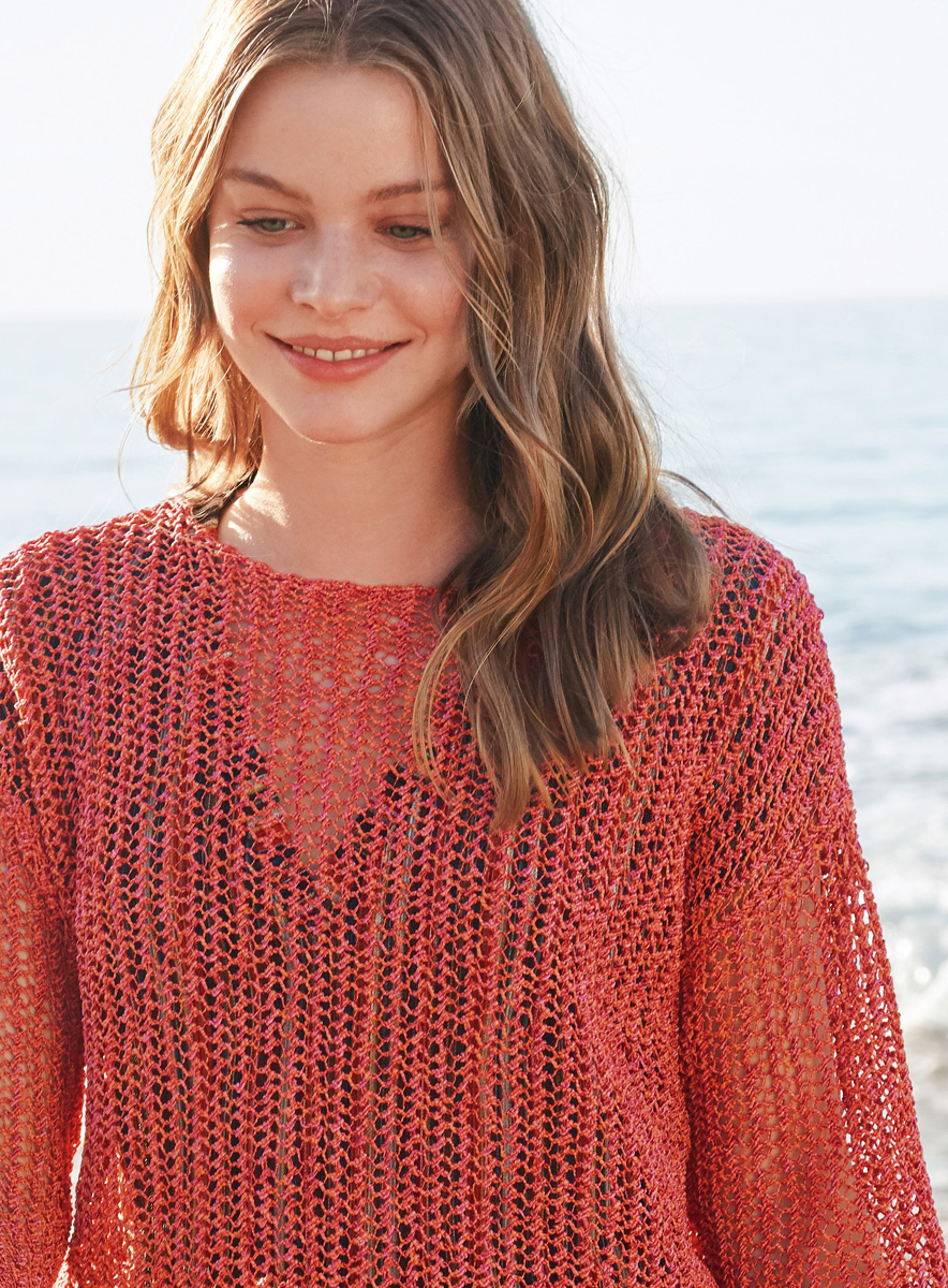 350 (400, 450) g of Lana Grossa Ombra (75% cotton, 25% polyester; 120 m/50 g) in Oriental Red/Pumpkin (col 17). Size 3.5 and 4 mm needles; size 4 mm circular needle, 60 cm long