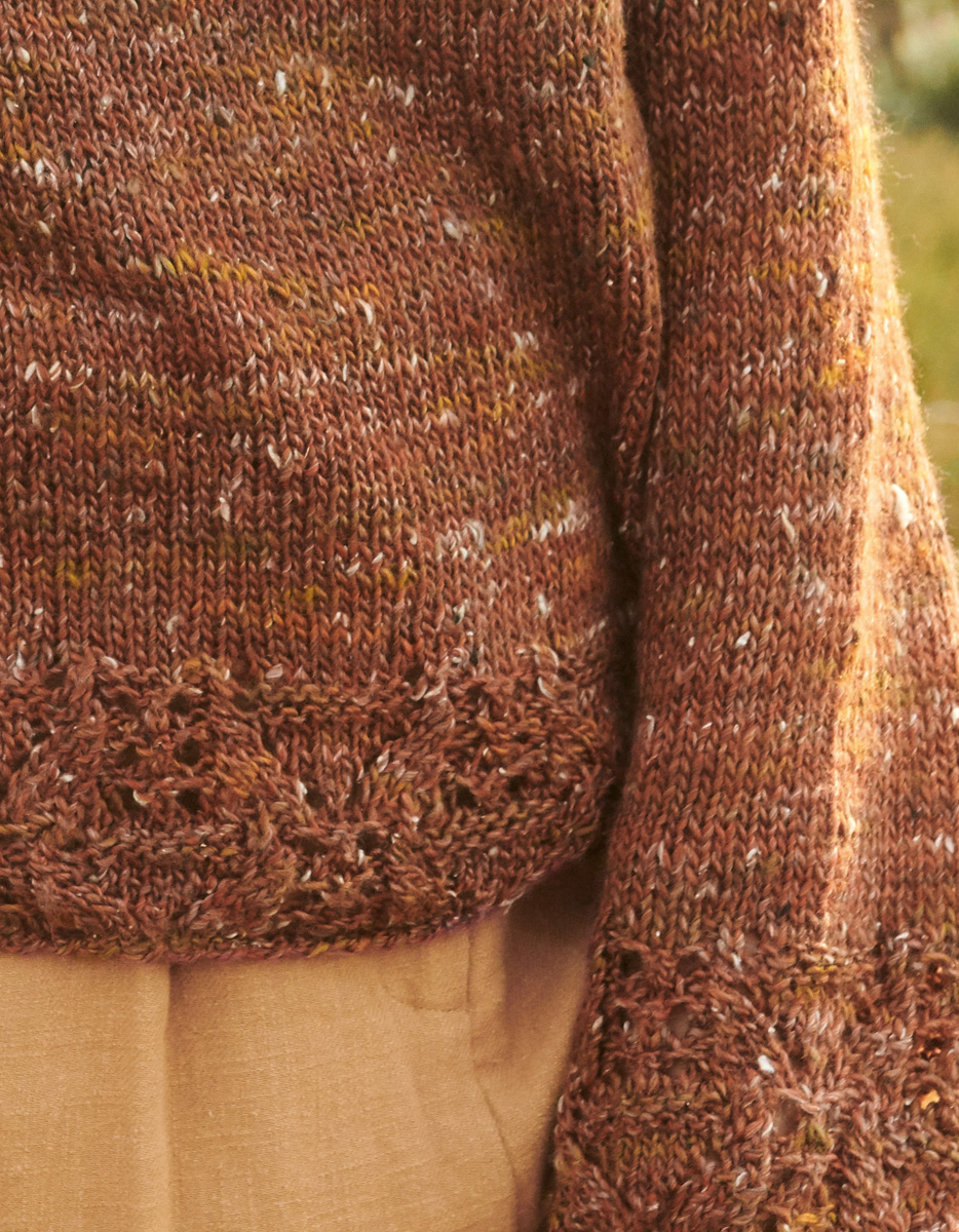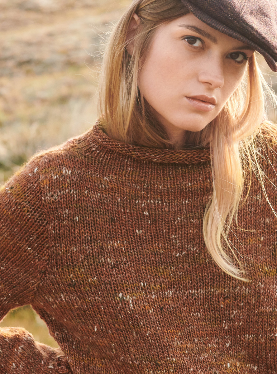 350 (400) g of Lana Grossa Only Tweed (76% superwash Merino wool, 16% acrylic; 5% silk; 3% viscose; 135 m/50 g) in Red-Brown/Olive/Natural/Nougat/Dark Grey (col 105). Size 5.5 mm needles; size 5 mm circular needle, 50 cm long; size 5 mm crochet hook