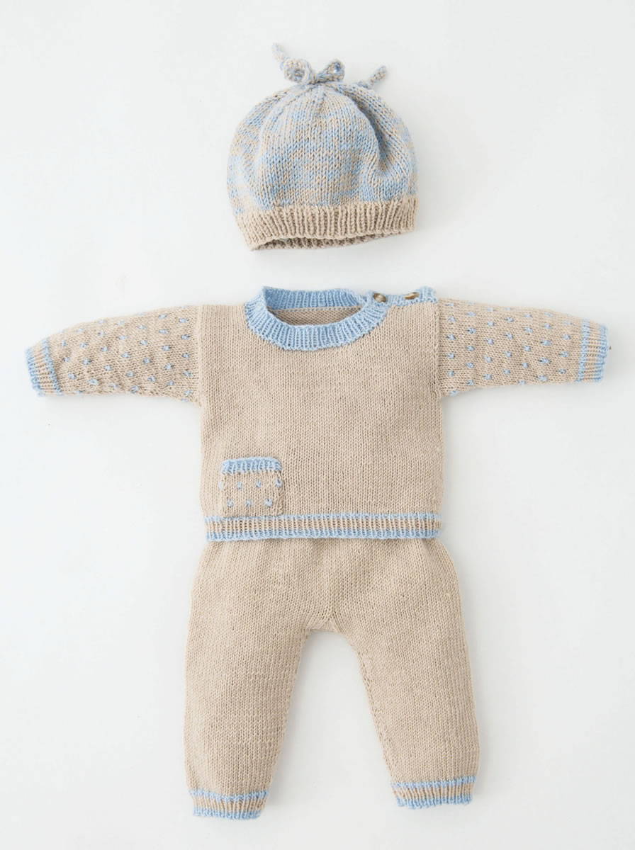 100 (100, 150) g of Lana Grossa Cool Wool Baby (100% pure wool; 220 m/50 g) in Greige (col 212) and 50 g in Light Blue (col 208). Size 3 mm needles; size 3 mm circular needle, 40 cm long; size 4.5 mm needles; one set size 4.5 mm double-pointed needles [dpns]; two buttons; waistband elastic