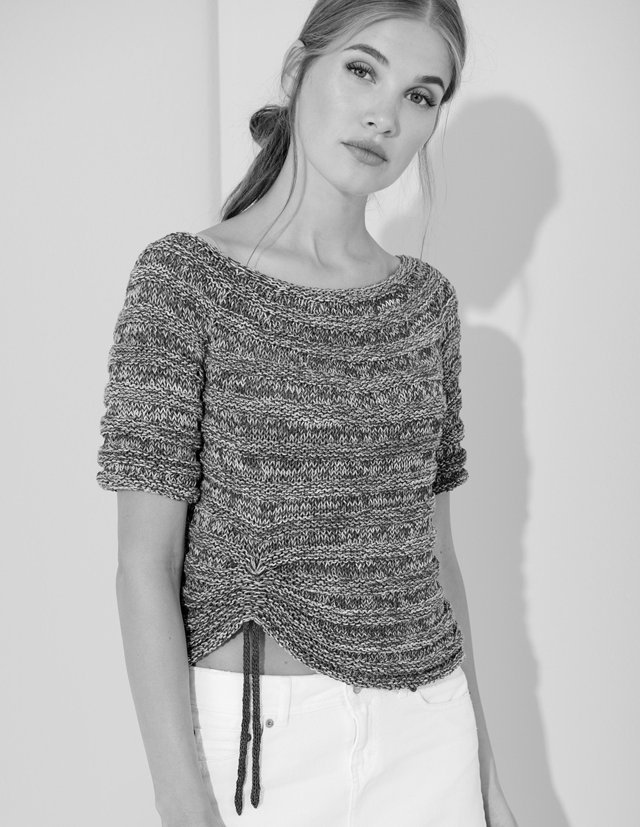200 (200, 300) g of Lana Grossa Pappagallo (50% cotton, 50% microfiber; 340 m/100 g) in Light Grey/ Camel/Dark Brown/Petrol/Olive (col 1) and 200 (250, 300) g of Lana Grossa Capri (55% cotton, 30% polyamide, 15% silk; 150 m/50 g) in Ocean Blue (col 15). Size 6 mm needles; size 6 mm circular needles in various lengths; two 5 mm doublepointed needles [dpns].