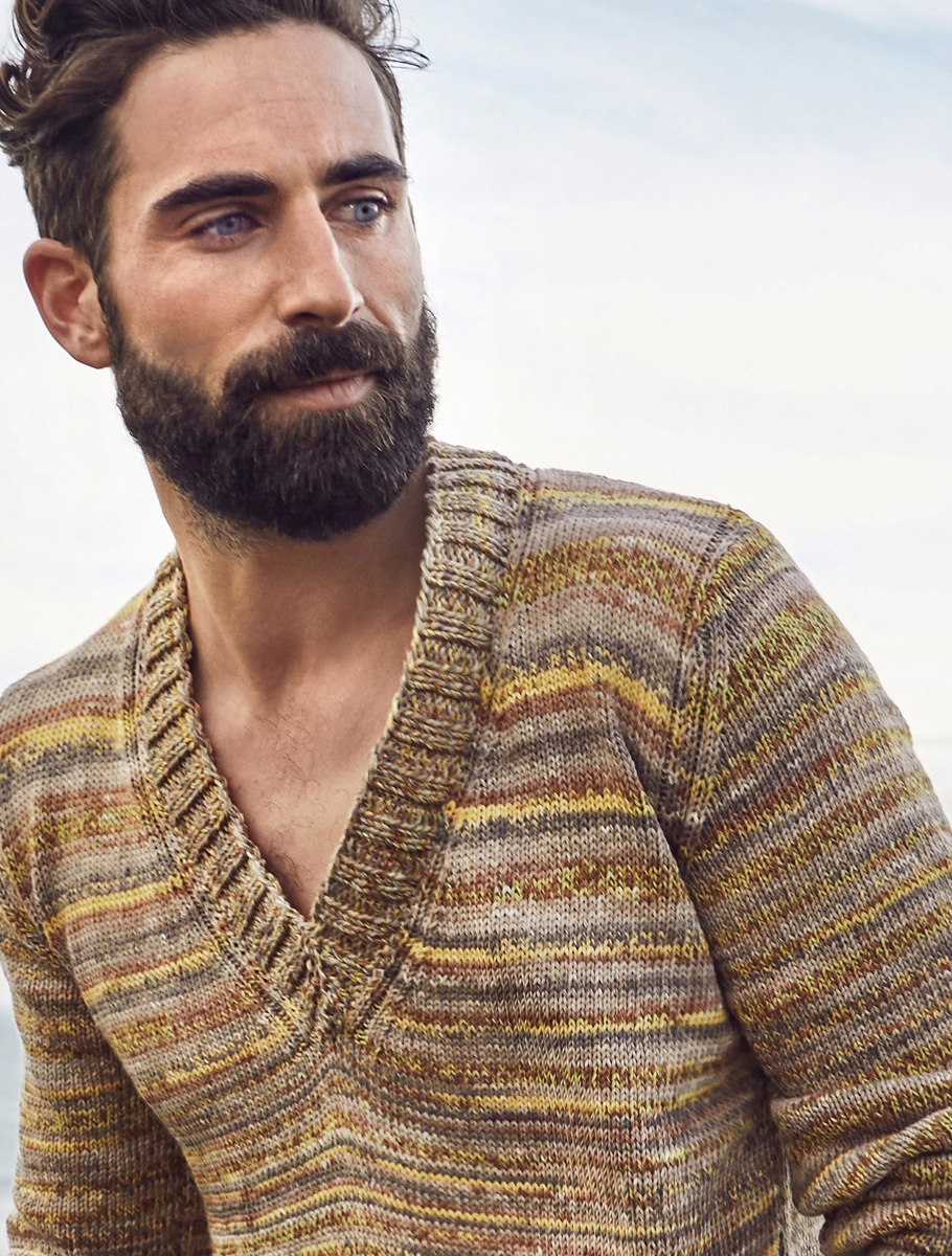 500 (600, 700) g of Lana Grossa Pappagallo (50% cotton, 50% microfiber; 340 m/100 g) in Brown/Yellow-Green/ Natural/Dark Grey/Greige/Grey-Brown (col 12). Size 3 and 4 mm needles; size 4 mm circular needle, 40 cm long