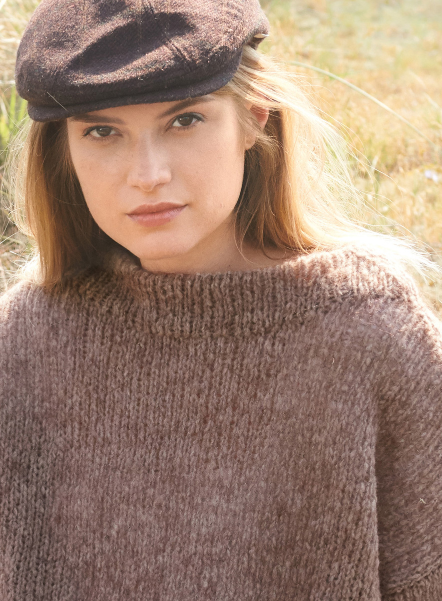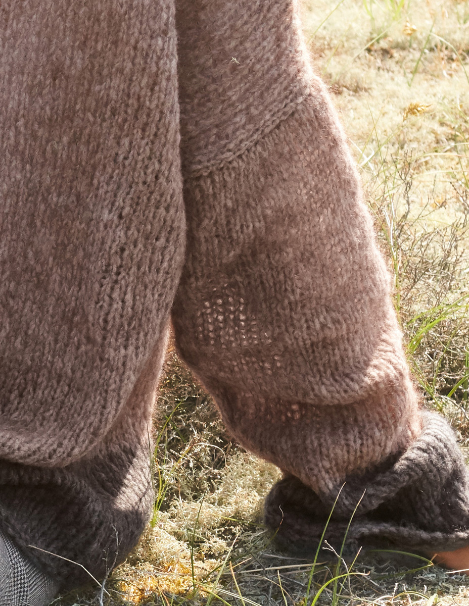 200 (250, 300) g of Lana Grossa Peloso (54% Merino wool, 26% mohair, 20% acrylic; 210 m/50 g) in Greige (col 8) and 50 (100, 100) g in Dark Grey (col 9). Size 6 mm needles; size 5 mm circular needle, 60 cm long