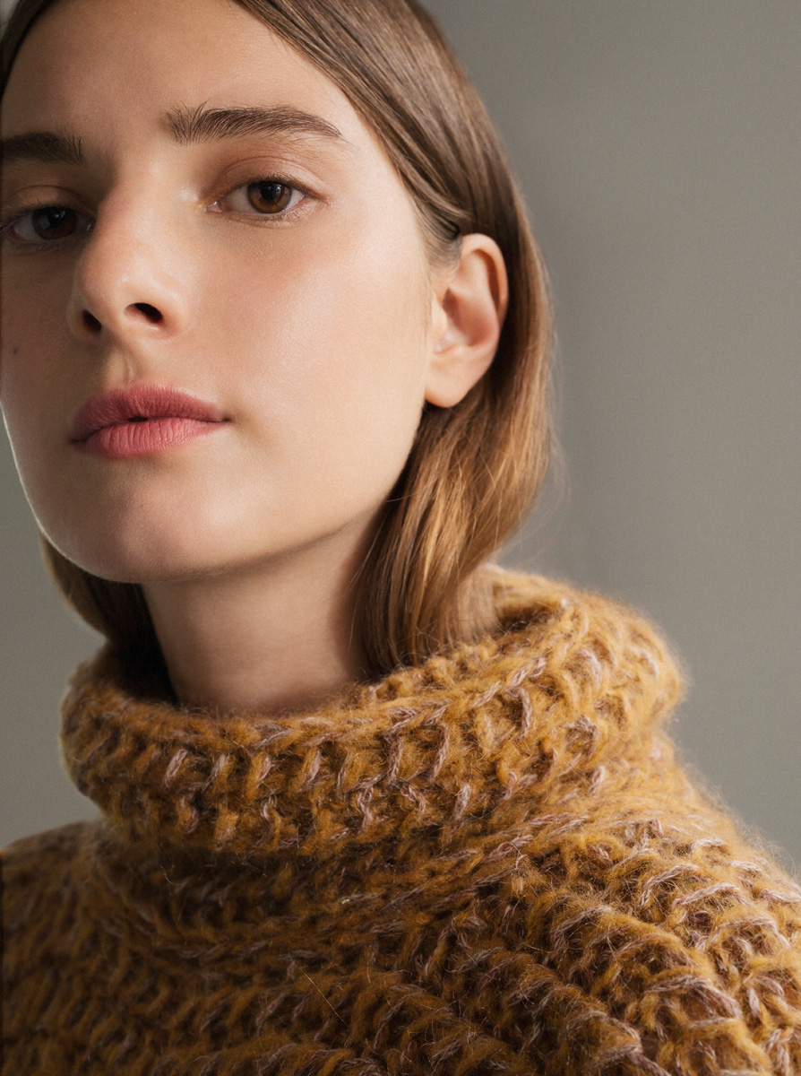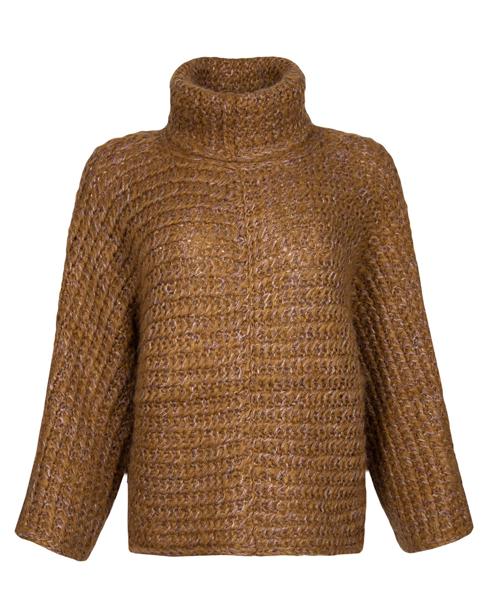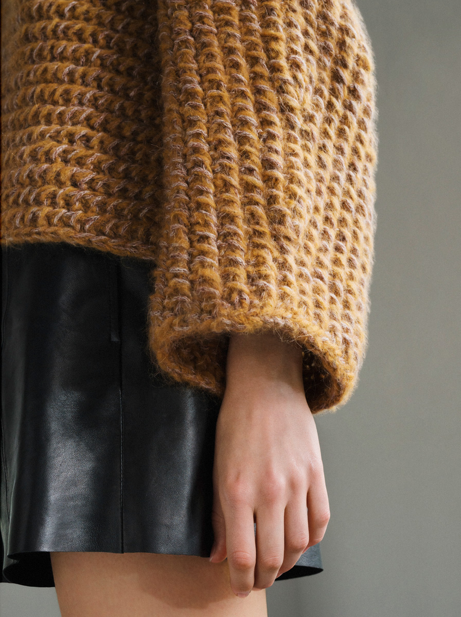 300 (350, 400) g of Lana Grossa Peloso (54 % pure wool, 26 % mohair, 20 % acrylic; 210 m / 50 g) in Gold-Brown (col 7) and 250 (300, 350) g of Lana Grossa Smokey (46 % pure wool, 41 % cotton, 8 % polyamide, 5 % yak; 225 m 50 g) in Greige / Red-Brown / Light Grey (col 205). Size 8 and 9 mm needles
