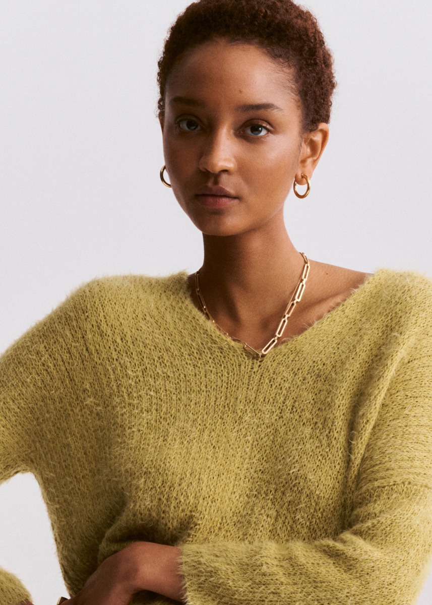 300 (350, 400) g of Lana Grossa Per Fortuna (74% organic cotton, 26% polyamide; 190 m/50 g) in Mustard (col 13). Size 3 and 6 mm needles