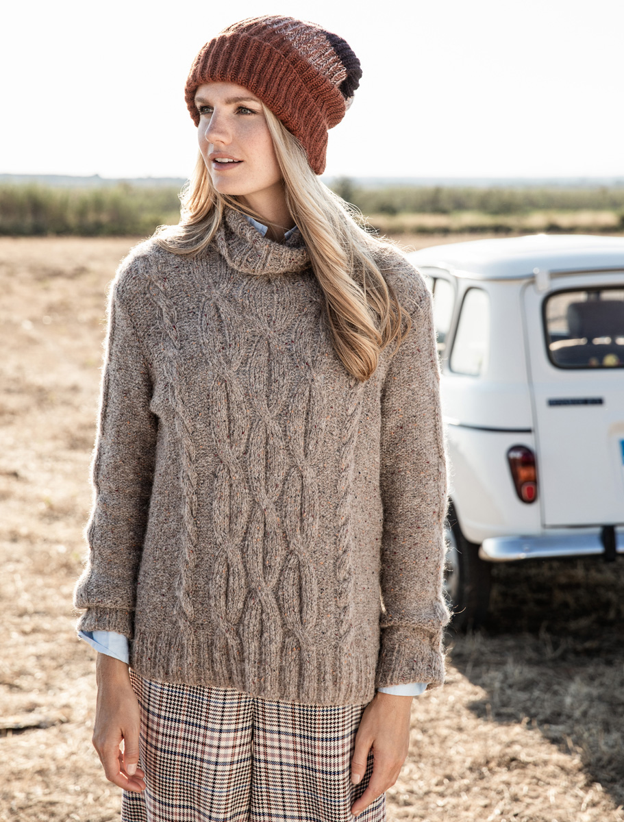 350 (400, 450) g of Lana Grossa Peru Tweed (40% alpaca, 32% viscose, 20% polyamide, 8% pure wool; 175 m/50 g) in Beige (col 2). Size 4.5 and 5 mm needles; size 4.5 mm circular needle, 40 cm long; 2 cable needles [cn