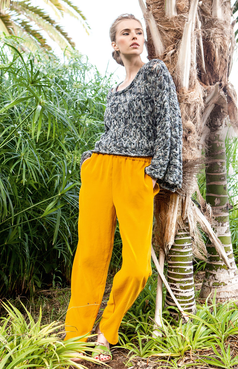 650 (700, 750) g of Lana Grossa Pezza (70% cotton, 30% polyester; 70 m/50 g) in Grey/Light Grey/Grey-Beige/Charcoal (col 1). Size 8 and 9 mm needles; size 8 mm circular needle, 40 cm long; size 4.5 mm crochet hook.