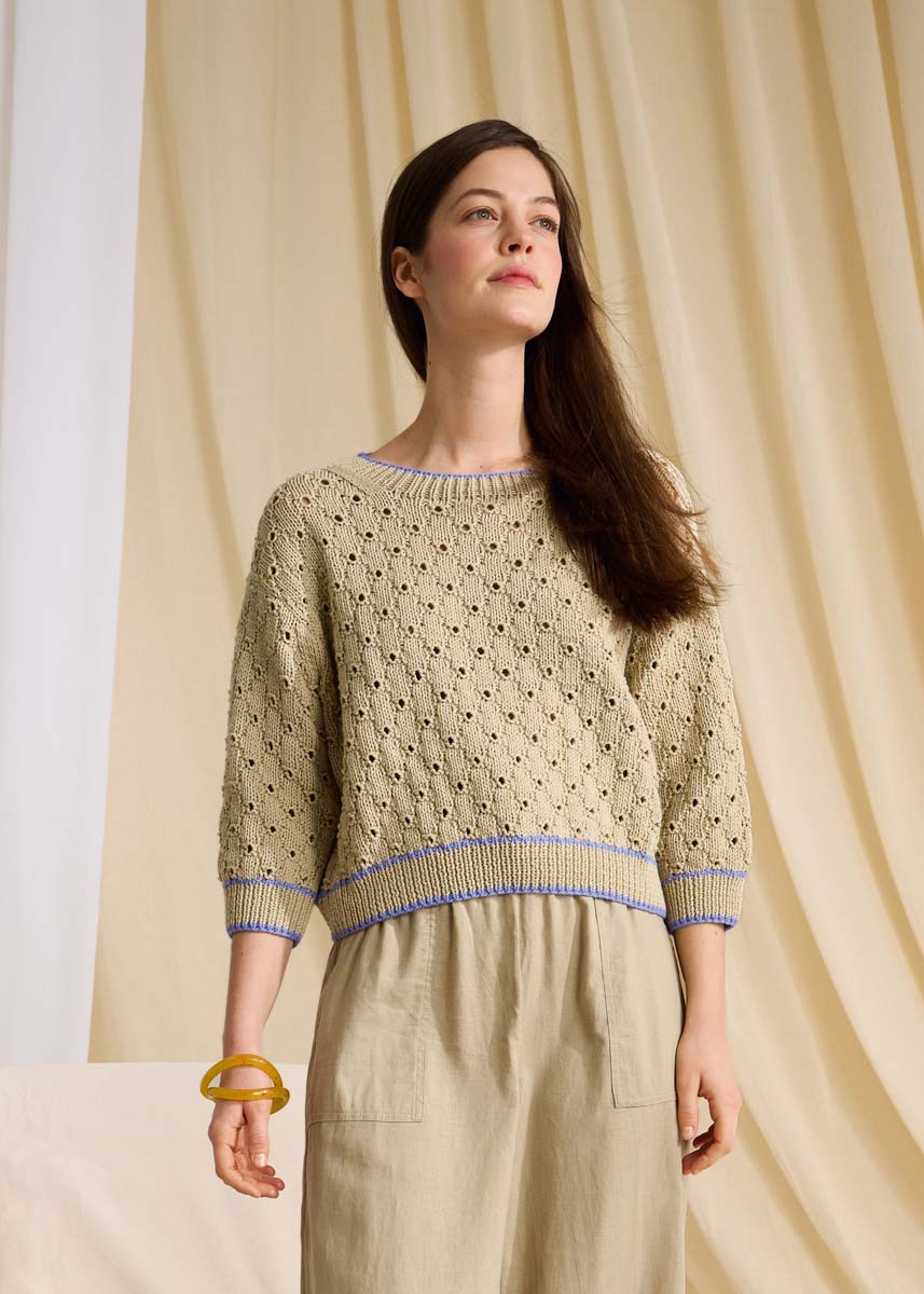 400 (450, 500) g of Lana Grossa Promessa (70% organic cotton, 30% recycled polyamide; 125 m/50 g) in Grey Beige (col 15) and 50 g in Purple (col 29). Size 4 and 5.5 mm needles; size 4 mm circular needle, 40 cm long
