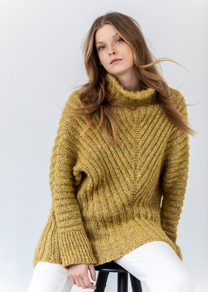 450 g of Lana Grossa Sara (65% cotton, 30% baby alpaca, 5% Merino wool; 125 m/50 g) in Yellow Mélange (col 13). Size 5.5 and 7 mm needles; size 7 mm circular needle, 100 cm long; size 5.5 mm circular needle, 50 cm long