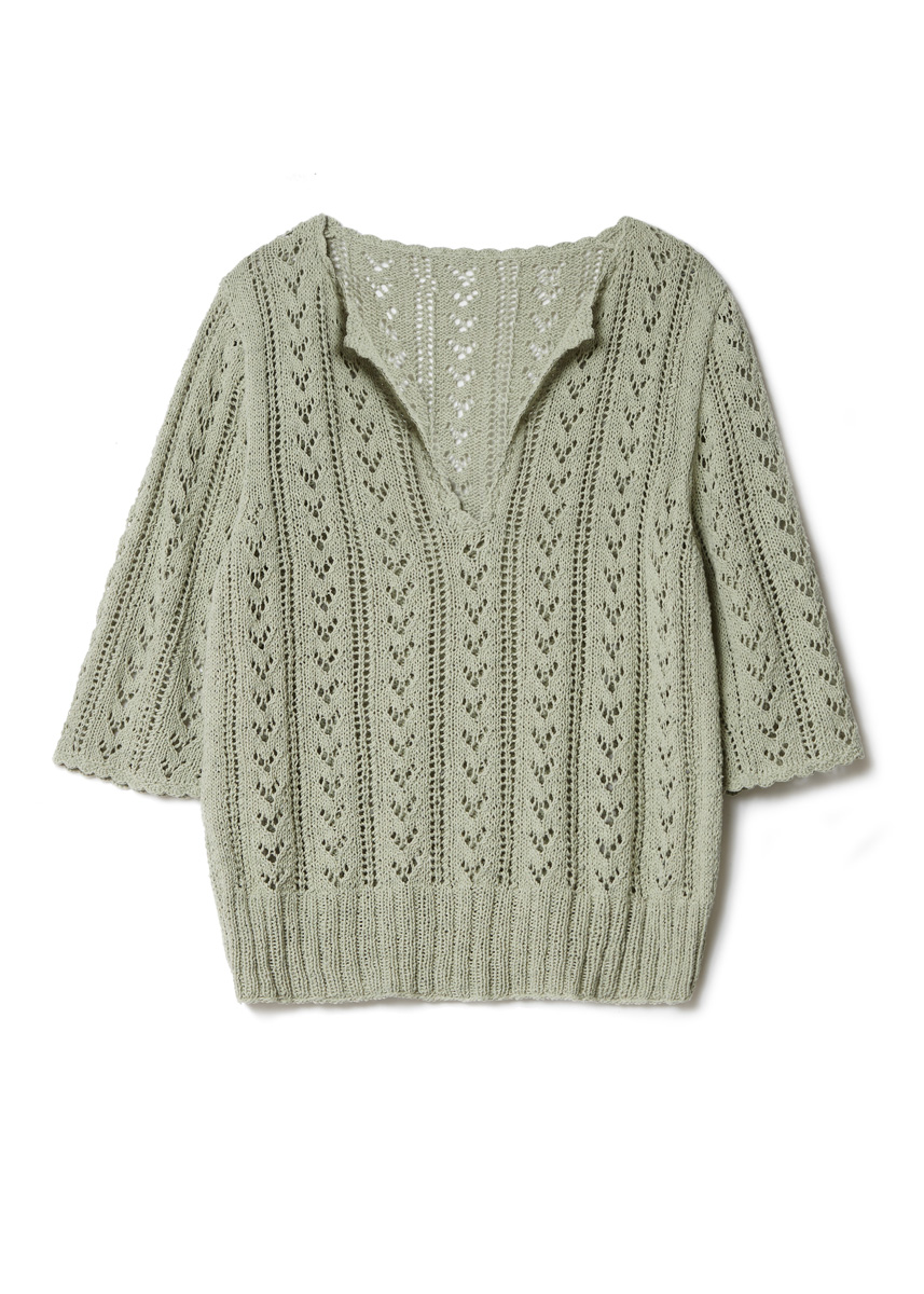 300 (350, 400) g of Lana Grossa Setapura (100% silk; 200 m/50 g) in Tea Green (col 14). Size 3.5 mm needles; size 2.5 mm crochet hook