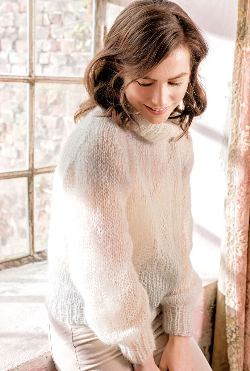 150 g of Lana Grossa Silkhair Degradé (70% superkid mohair, 30% silk; 400 m/50 g) in Ecru/Grey/Light Grey (col 801). Size 7 and 10 mm circular needles, 40 and 80 cm long; stitch holders or spare needles.