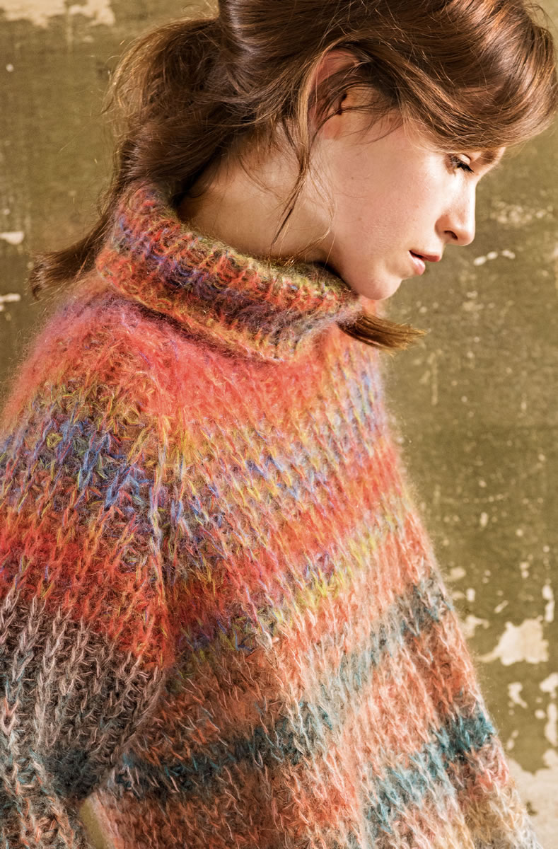 150 (150, 200) g of Lana Grossa Silkhair Print (70% superkid mohair, 30% silk; 400m/50 g) in Orange/Petrol/Pink/Khaki (col 343), 150 (150, 150) g in Red/Blue/Light Green/Dark Violet (col 335), 100 (150, 150) g in Natural/Light Blue/Camel/Khaki/Grey-Brown (col 341) and 50 g in Peach/Greige/Beige/Pale Purple (col 346). Size 5 mm circular needle, 40 cm long; size 7 and 8 mm circular needles, each 80 cm long; stitch holders or spare needles.