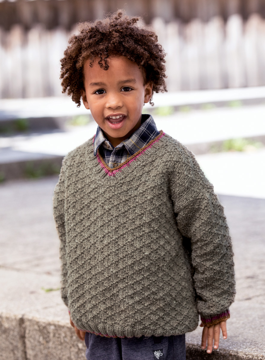300 (350) g of Lana Grossa Slow Wool Canapa (90% superwash Merino wool, 10% hemp; 100 m/50 g) in Greige (col 4) and 50 g each in Brown (col 3) and Fuchsia (col 12). Size 4 and 4.5 mm needles; size 4 mm circular needle, 40 cm long