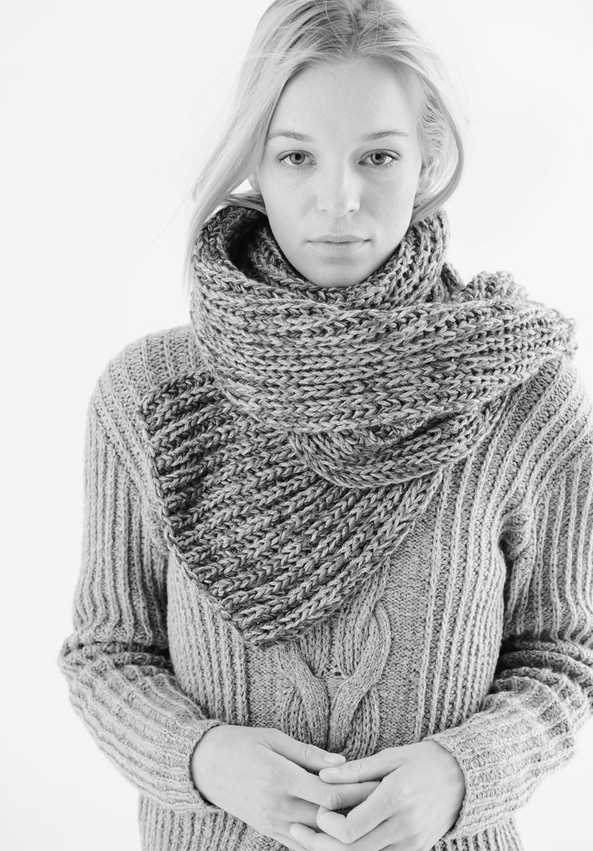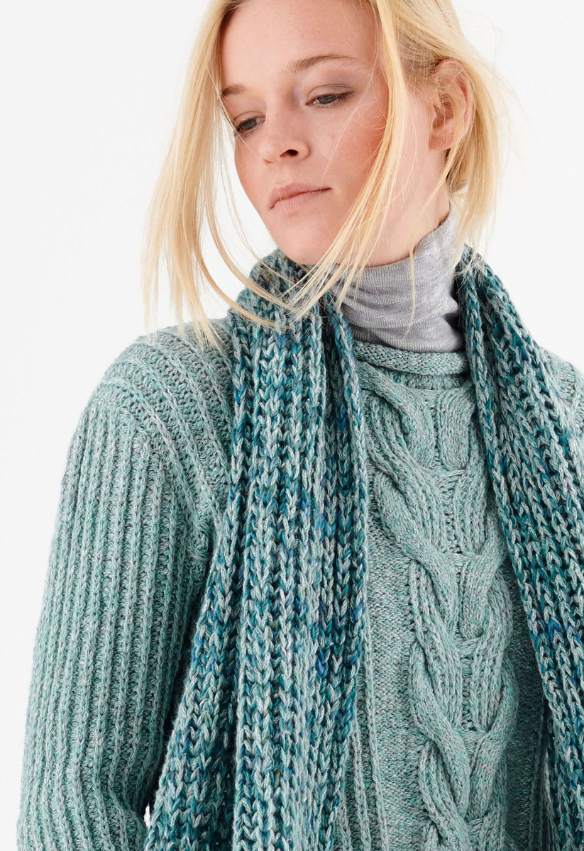 350 (400, 450) g of Lana Grossa Smokey (46% Merino wool, 41% cotton, 8% polyamide, 5% yak; 225 m/50 g) in Pastel Petrol/Light Grey (col 212). Size 4 and 4.5 mm needles; size 4.5 mm circular needle, 40 cm long; 2 cable needles [cn]