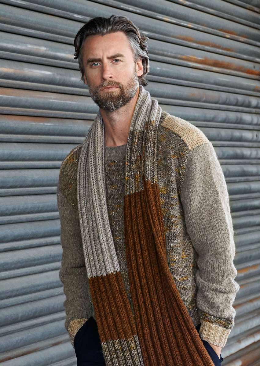 150 (200, 250) g of Lana Grossa Smokey (46% Merino wool, 41% cotton, 8% polyamide, 5% yak; 225 m/50 g) in Linen/Beige/Sand (col 206), 150 (200, 250) g of Lana Grossa Only Tweed (76% superwash Merino wool, 16% acrylic, 5% silk, 3% viscose; 135 m/50 g) in Grey-Brown/Beige/Mustard/Ochre (col 107) and 100 (150, 200) g of Lana Grossa Cool Air Fine (50% Merino wool, 28% baby alpaca, 22% polyamide; 240 m/50 g) in Taupe (col 11). Size 3 and 5 mm needles; size 3 mm circular needle, 40 cm long
